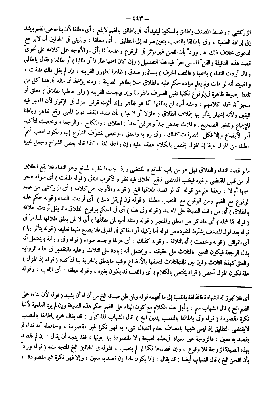 الزَّرْكَشِيُّ: وَضَبْطُ الْمُصَنِّفِ يَا طَالِقْ بِالسُّكُونِ لِيُفِيدَ أَنَّهُ فِي يَا طَالِقُ بِالضَّمِّ لَا يَقَعُ: أَيْ مُطْلَقًا لِأَنَّ بِنَاءَهُ عَلَى الضَّمِّ يُرْشِدُ إلَى إرَادَةِ الْعَلَمِيَّةِ، وَفِي يَا طَالِقًا بِالنَّصْبِ يَتَعَيَّنُ صَرْفُهُ إلَى التَّطْلِيقِ: أَيْ مُطْلَقًا، وَيَنْبَغِي فِي الْحَالَيْنِ أَنْ لَا يَرْجِعَ لِدَعْوَى خِلَافِ ذَلِكَ اهـ. وَرُدَّ بِأَنَّ اللَّحْنَ غَيْرُ مُؤَثِّرٍ فِي الْوُقُوعِ وَعَدَمِهِ كَمَا يَأْتِي، وَالْأَوْجَهُ حَمْلُ كَلَامِهِ عَلَى نَحْوِيٍّ قَصَدَ هَذِهِ الدَّقِيقَةَ، وَالْقِنُّ الْمُسَمَّى حُرًّا فِيهِ هَذَا التَّفْصِيلُ.