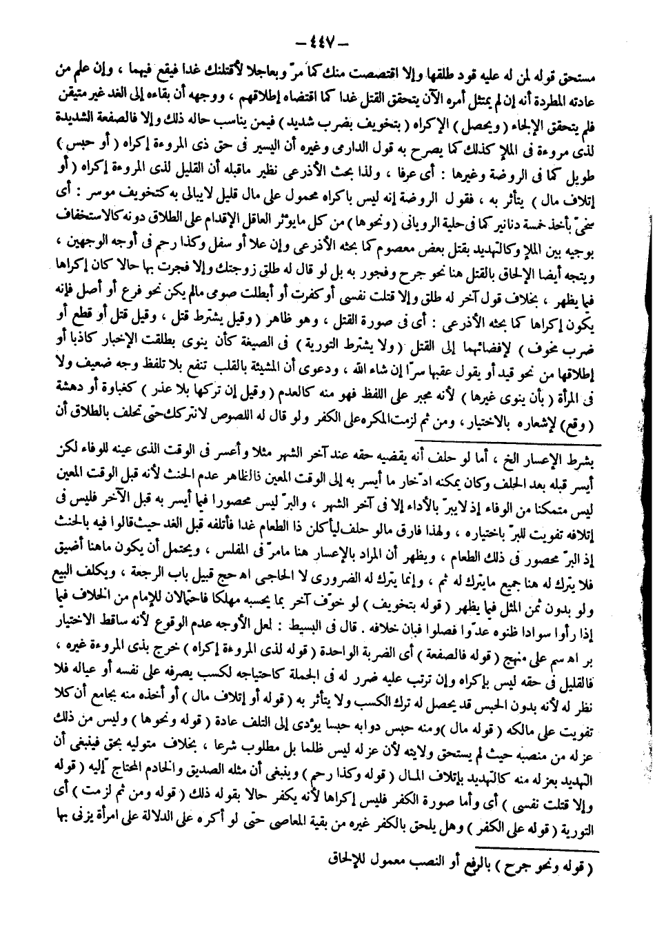 (وَيَحْصُلُ) الْإِكْرَاهُ (بِتَخْوِيفٍ) (بِضَرْبٍ شَدِيدٍ) فِيمَنْ يُنَاسِبُ ذَلِكَ وَإِلَّا فَالصَّفْعَةُ الشَّدِيدَةُ لِذِي مُرُوءَةٍ فِي الْمَلَإِ كَذَلِكَ كَمَا يُصَرِّحُ بِهِ قَوْلُ الدَّارِمِيِّ وَغَيْرِهِ أَنَّ الْيَسِيرَ فِي حَقِّ ذِي الْمُرُوءَةِ إكْرَاهٌ (أَوْ حَبْسٍ) طَوِيلٍ كَمَا فِي الرَّوْضَةِ وَغَيْرِهَا: أَيْ عُرْفًا، وَلِذَا بَحَثَ الْأَذْرَعِيُّ نَظِيرَ مَا قَبْلَهُ أَنَّ الْقَلِيلَ لِذِي الْمُرُوءَةِ إكْرَاهٌ (أَوْ إتْلَافِ مَالٍ) يَتَأَثَّرُ بِهِ، فَقَوْلُ الرَّوْضَةِ إنَّهُ لَيْسَ بِإِكْرَاهٍ مَحْمُولٌ عَلَى مَالٍ قَلِيلٍ لَا يُبَالِي بِهِ كَتَخْوِيفِ مُوسِرٍ: أَيْ سَخِيٍّ بِأَخْذِ خَمْسَةِ دَنَانِيرَ كَمَا فِي حِلْيَةِ الرُّويَانِيِّ (وَنَحْوِهَا) مِنْ كُلِّ مَا يُؤْثِرُ الْعَاقِلُ الْإِقْدَامَ عَلَى الطَّلَاقِ دُونَهُ كَالِاسْتِخْفَافِ بِوَجِيهٍ بَيْنَ الْمَلَإِ وَكَالتَّهْدِيدِ بِقَتْلِ بَعْضِ مَعْصُومٍ كَمَا بَحَثَهُ الْأَذْرَعِيُّ وَإِنْ عَلَا أَوْ سَفَلَ وَكَذَا رَحِمٌ فِي أَوْجَهِ الْوَجْهَيْنِ، وَيَتَّجِهُ أَيْضًا الْإِلْحَاقُ بِالْقَتْلِ هُنَا نَحْوَ جُرْحٍ وَفُجُورٍ بِهِ بَلْ لَوْ قَالَ لَهُ طَلِّقْ زَوْجَتَك وَإِلَّا فَجَرْت بِهَا حَالًا كَانَ إكْرَاهًا فِيمَا يَظْهَرُ، بِخِلَافِ قَوْلِ آخَرَ لَهُ طَلِّقْ وَإِلَّا قَتَلْت نَفْسِي أَوْ كَفَرْت أَوْ أَبْطَلْت صَوْمِي مَا لَمْ يَكُنْ نَحْوَ فَرْعٍ أَوْ أَصْلٍ فَإِنَّهُ يَكُونُ إكْرَاهًا كَمَا بَحَثَهُ الْأَذْرَعِيُّ: أَيْ فِي صُورَةِ الْقَتْلِ، وَهُوَ ظَاهِرٌ (وَقِيلَ يُشْتَرَطُ قَتْلٌ، وَقِيلَ قَتْلٌ أَوْ قَطْعٌ أَوْ ضَرْبُ مَخُوفٍ) لِإِفْضَائِهِمَا إلَى الْقَتْلِ (وَلَا يُشْتَرَطُ التَّوْرِيَةُ) فِي الصِّيغَةِ كَأَنْ يَنْوِيَ بِ طَلَّقْت الْإِخْبَارَ كَاذِبًا أَوْ إطْلَاقَهَا مِنْ نَحْوِ قَيْدٍ أَوْ يَقُولُ عَقِبَهَا سِرًّا إنْ شَاءَ اللَّهُ، وَدَعْوَى أَنَّ الْمَشِيئَةَ بِالْقَلْبِ تَنْفَعُ بِلَا تَلَفُّظٍ وَجْهٌ ضَعِيفٌ وَلَا فِي الْمَرْأَةِ (بِأَنْ يَنْوِيَ غَيْرَهَا) لِأَنَّهُ مُجْبَرٌ عَلَى اللَّفْظِ فَهُوَ مِنْهُ كَالْعَدَمِ (وَقِيلَ إنْ تَرَكَهَا بِلَا عُذْرٍ) كَغَبَاوَةٍ أَوْ دَهْشَةٍ (وَقَعَ) لِإِشْعَارِهِ بِالِاخْتِيَارِ، وَمِنْ ثَمَّ لَزِمَتْ الْمُكْرَهَ عَلَى الْكُفْرِ وَلَوْ قَالَ لَهُ اللُّصُوصُ لَا نَتْرُكُك حَتَّى تَحْلِفَ بِالطَّلَاقِ أَنْ