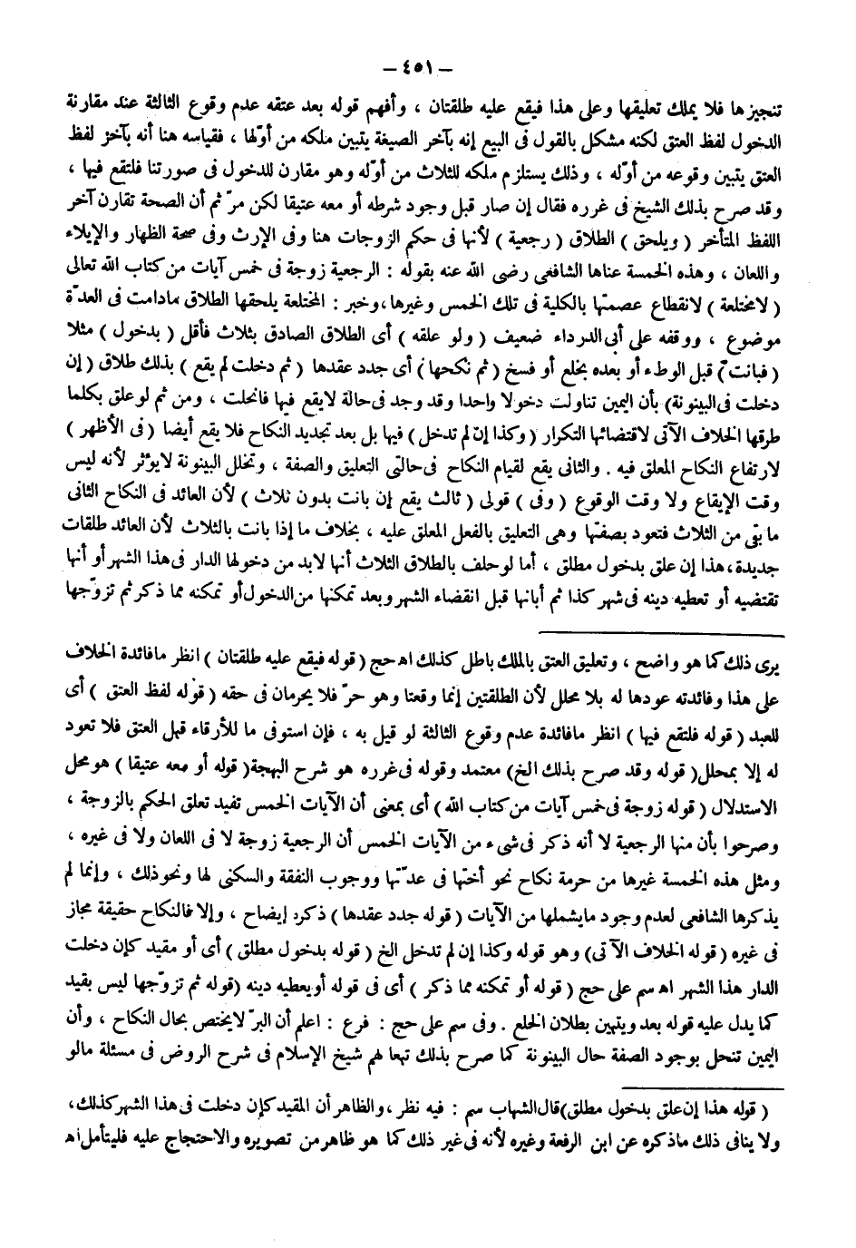 ـــــــــــــــــــــــــــــSيَرَى ذَلِكَ كَمَا هُوَ وَاضِحٌ، وَتَعْلِيقُ الْعِتْقِ بِالْمِلْكِ بَاطِلٌ كَذَلِكَ اهـ حَجّ (قَوْلُهُ: فَيَقَعُ عَلَيْهِ طَلْقَتَانِ) اُنْظُرْ مَا فَائِدَةُ الْخِلَافِ عَلَى هَذَا وَفَائِدَتُهُ عَوْدُهَا لَهُ بِلَا مُحَلِّلٍ لِأَنَّ الطَّلْقَتَيْنِ إنَّمَا وَقَعَتَا وَهُوَ حُرٌّ فَلَا يَحْرُمَانِ فِي حَقِّهِ (قَوْلُهُ: لَفْظَ الْعِتْقِ) أَيْ لِلْعَبْدِ (قَوْلُهُ: فَلْتَقَعْ فِيهَا) اُنْظُرْ مَا فَائِدَةُ عَدَمِ وُقُوعِ الثَّالِثَةِ لَوْ قِيلَ بِهِ، فَإِنْ اسْتَوْفَى مَا لِلْأَرِقَّاءِ قَبْلَ الْعِتْقِ فَلَا تَعُودُ لَهُ إلَّا بِمُحَلِّلٍ (قَوْلُهُ وَقَدْ صَرَّحَ بِذَلِكَ إلَخْ) مُعْتَمَدٌ وَقَوْلُهُ فِي غُرَرِهِ هُوَ شَرْحُ الْبَهْجَةِ (قَوْلُهُ: أَوْ مَعَهُ عَتِيقًا) هُوَ مَحَلُّ الِاسْتِدْلَالِ (قَوْلُهُ: زَوْجَةٌ فِي خَمْسِ آيَاتٍ مِنْ كِتَابِ اللَّهِ) أَيْ بِمَعْنَى أَنَّ الْآيَاتِ الْخَمْسَ تُفِيدُ تَعَلُّقَ الْحُكْمِ بِالزَّوْجَةِ، وَصَرَّحُوا بِأَنَّ مِنْهَا الرَّجْعِيَّةَ لَا أَنَّهُ ذَكَرَ فِي شَيْءٍ مِنْ الْآيَاتِ الْخَمْسِ أَنَّ الرَّجْعِيَّةَ زَوْجَةٌ لَا فِي اللِّعَانِ وَلَا فِي غَيْرِهِ، وَمِثْلُ هَذِهِ الْخَمْسَةِ غَيْرُهَا مِنْ حُرْمَةِ نِكَاحٍ نَحْوَ أُخْتِهَا فِي عِدَّتِهَا وَوُجُوبِ النَّفَقَةِ وَالسُّكْنَى لَهَا وَنَحْوَ ذَلِكَ، وَإِنَّمَا لَمْ يَذْكُرْهَا الشَّافِعِيُّ لِعَدَمِ وُجُودِ مَا يَشْمَلُهَا مِنْ الْآيَاتِ.