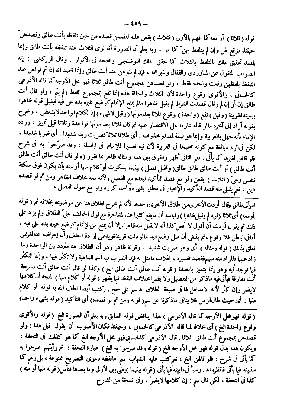 وَقَالَ الزَّرْكَشِيُّ: إنَّهُ الصَّوَابُ الْمَنْقُولُ عَنْ الْمَاوَرْدِيِّ وَالْقَفَّالِ وَغَيْرِهِمَا، فَإِنْ لَمْ يَنْوِهِنَّ عِنْدَ أَنْتِ طَالِقٌ وَإِنَّمَا قَصَدَ أَنَّهُ إذَا تَمَّ نَوَاهُنَّ عِنْدَ التَّلَفُّظِ بِلَفْظِهِنَّ وَقَعَتْ وَاحِدَةٌ فَقَطْ، وَلَوْ قَصَدَهُنَّ بِمَجْمُوعِ أَنْتِ طَالِقٌ ثَلَاثًا فَهُوَ مَحَلُّ الْأَوْجَهِ كَمَا قَالَهُ الْأَذْرَعِيُّ كَالْحَسَّانِيِّ، وَالْأَقْوَى وُقُوعُ وَاحِدَةٍ لِأَنَّ الثَّلَاثَ وَالْحَالَةَ هَذِهِ إنَّمَا تَقَعُ بِمَجْمُوعِ اللَّفْظِ وَلَمْ يَتِمَّ، وَلَوْ قَالَ أَنْتِ طَالِقٌ إنْ أَوْ إنْ لَمْ وَقَالَ قَصَدْت الشَّرْطَ لَمْ يُقْبَلْ ظَاهِرًا مَا لَمْ يُمْنَعْ الْإِتْمَامُ كَوَضْعِ غَيْرِهِ يَدَهُ عَلَى فِيهِ فَيُقْبَلُ قَوْلُهُ ظَاهِرًا بِيَمِينِهِ لِلْقَرِينَةِ (وَقِيلَ) تَقَعُ (وَاحِدَةٌ) لِوُقُوعِ ثَلَاثًا بَعْدَ مَوْتِهَا (وَقِيلَ لَا شَيْءَ) إذْ الْكَلَامُ الْوَاحِدُ لَا يَتَبَعَّضُ، وَخَرَجَ بِقَوْلِهِ أَرَادَ إلَى آخِرِهِ مَا لَوْ قَالَهُ عَازِمًا عَلَى الِاقْتِصَارِ عَلَيْهِ ثُمَّ قَالَ ثَلَاثًا بَعْدَ مَوْتِهَا فَوَاحِدَةً وَثَلَاثًا قِيلَ تَمْيِيزٌ، وَرَدَّهُ الْإِمَامُ بِأَنَّهُ جَهْلٌ بِالْعَرَبِيَّةِ وَإِنَّمَا هُوَ صِفَةٌ لِمَصْدَرٍ مَحْذُوفٍ: أَيْ طَلَاقًا ثَلَاثًا كَضَرَبْت زَيْدًا شَدِيدًا: أَيْ ضَرْبًا شَدِيدًا، لَكِنْ فِي الرَّدِّ مُبَالَغَةٌ مَعَ كَوْنِهِ صَحِيحًا فِي الْعَرَبِيَّةِ لِأَنَّ فِيهِ تَفْسِيرًا لِلْإِبْهَامِ فِي الْجُمْلَةِ، وَقَدْ صَرَّحُوا بِهِ فِي شَرْحٍ فَلَوْ قَالَهُنَّ لِغَيْرِهَا كَمَا يَأْتِي. نَعَمْ الثَّانِي أَظْهَرُ وَالْفَرْقُ بَيْنَ هَذَا وَمِثَالِهِ ظَاهِرٌ مِمَّا تَقَرَّرَ.