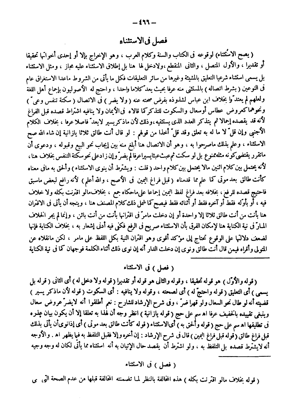 فَصْلٌ فِي الِاسْتِثْنَاءِ (يَصِحُّ الِاسْتِثْنَاءُ) لِوُقُوعِهِ فِي الْكِتَابِ وَالسُّنَّةِ وَكَلَامِ الْعَرَبِ، وَهُوَ الْإِخْرَاجُ بِإِلَّا أَوْ إحْدَى أَخَوَاتِهَا تَحْقِيقًا أَوْ تَقْدِيرًا، وَالْأَوَّلُ الْمُتَّصِلُ، وَالثَّانِي الْمُنْقَطِعُ، وَلَا دَخْلَ لَهَا هُنَا بَلْ إطْلَاقُ الِاسْتِثْنَاءِ عَلَيْهِ مَجَازٌ، وَمِثْلُ الِاسْتِثْنَاءِ بَلْ يُسَمَّى اسْتِثْنَاءً شَرْعِيًّا التَّعْلِيقُ بِالْمَشِيئَةِ وَغَيْرِهَا مِنْ سَائِرِ التَّعْلِيقَاتِ فَكُلُّ مَا يَأْتِي مِنْ الشُّرُوطِ مَا عَدَا الِاسْتِغْرَاقَ عَامٌّ فِي النَّوْعَيْنِ (بِشَرْطِ اتِّصَالِهِ) بِالْمُسْتَثْنَى مِنْهُ عُرْفًا بِحَيْثُ يُعَدُّ كَلَامًا وَاحِدًا، وَاحْتَجَّ لَهُ الْأُصُولِيُّونَ بِإِجْمَاعِ أَهْلِ اللُّغَةِ وَلَعَلَّهُمْ لَمْ يَعْتَدُّوا بِخِلَافِ ابْنِ عَبَّاسٍ لِشُذُوذِهِ بِفَرْضِ صِحَّتِهِ عَنْهُ (وَلَا يَضُرُّ) فِي الِاتِّصَالِ (سَكْتَةُ تَنَفُّسٍ وَعِيٍّ) وَنَحْوُهُمَا كَعُرُوضِ عُطَاسٍ أَوْ سُعَالٍ وَالسُّكُوتُ لِلتَّذَكُّرِ كَمَا قَالَاهُ فِي الْأَيْمَانِ وَلَا يُنَافِيهِ اشْتِرَاطُ قَصْدِهِ قَبْلَ الْفَرَاغِ لِأَنَّهُ قَدْ يَقْصِدُهُ إجْمَالًا ثُمَّ يَتَذَكَّرُ الْعَدَدَ الَّذِي يَسْتَثْنِيهِ، وَذَلِكَ لِأَنَّ مَا ذُكِرَ يَسِيرٌ لَا يُعَدُّ فَاصِلًا عُرْفًا، بِخِلَافِ الْكَلَامِ الْأَجْنَبِيِّ وَإِنْ قَلَّ لَا مَا لَهُ بِهِ تَعَلُّقٌ وَقَدْ قَلَّ أَخْذًا مِنْ قَوْلِهِمْ: لَوْ قَالَ أَنْتَ طَالِقٌ ثَلَاثًا يَا زَانِيَةُ إنْ شَاءَ اللَّهُ صَحَّ الِاسْتِثْنَاءُ، وَعُلِمَ بِذَلِكَ مَا صَرَّحُوا بِهِ، وَهُوَ أَنَّ الِاتِّصَالَ هُنَا أَبْلَغُ مِنْهُ بَيْنَ إيجَابِ نَحْوِ الْبَيْعِ وَقَبُولِهِ، وَدَعْوَى أَنَّ مَا تَقَرَّرَ يَقْتَضِي كَوْنَهُ مِثْلَهُ مَمْنُوعٌ بَلْ لَوْ سَكَتَ ثُمَّ عَبَثَ عَبَثًا يَسِيرًا عُرْفًا لَمْ يَضُرَّ وَإِنْ زَادَ عَلَى نَحْوِ سَكْتَةِ التَّنَفُّسِ بِخِلَافِ هُنَا، لِأَنَّهُ يُحْتَمَلُ بَيْنَ كَلَامِ اثْنَيْنِ مَا لَا يُحْتَمَلُ بَيْنَ كَلَامِ وَاحِدٍ.
