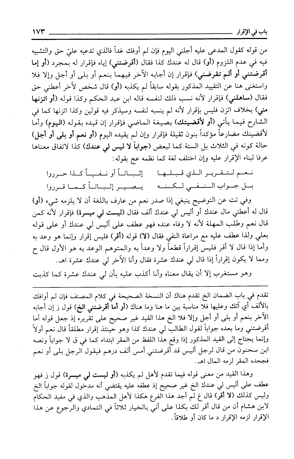 من قوله يقول المدعى عليه أجلني اليوم فإن لم أوفك غدًا فالذي تدعيه عليّ حق والتشبيه فيه في عدم اللزوم (أو) قال له عندك كذا فقال (أقرضتني) إياه فإقرار له بمجرد (أو إما أقرضتني أو ألم تقرضني) فإقرار إن أجابه الآخر فيهما بنعم أو بلى أو أجل وإلا فلا واستغنى هنا عن التقييد المذكور بقوله سابقًا لم يكذبه (أو) قال شخص لآخر أعطني حق فقال (ساهلني) فإقرار لأنه نسب ذلك لنفسه قاله ابن عبد الحكم وكذا قوله (أو اتزنها مني) بخلاف اتزن فليس بإقرار لأنه لم ينسبه لنفسه وسيذكر فيه قولين وكذا اتزنها كما في الشارح فيما يأتي (أو لأقضيتك) بصيغة الماضي فإقرار إن قيده بقوله (اليوم) وأما لأقضينك مضارعًا مؤكدًا بنون ثقيلة فإقرار وإن لم يقيده اليوم (أو نعم أو بلى أو أجل) حالة كونه في الثلاث بل الستة كما لبعض (جوابًا لا ليس لي عندك) كذا لاتفاق معناها عرفا لبناء الإقرار عليه وإن اختلف لغة كما نظمه عج بقوله: