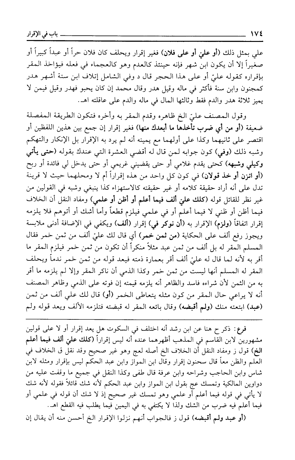وقول المصنف عليّ الخ ظاهره وقدم المقر به وأخره فتكون الطريقة المفصلة ضعيفة (أو من أي ضرب تأخذها ما أبعدك منها) فغير إقرار إن جمع بين هذين اللفظين أو اقتصر على ثانيهما وكذا على أولهما مع يمينه أنه لم يرد به الإقرار بل الإنكار والتهكم وشبه ذلك (وفي) كون جوابه لمن قال له أقضي العشرة التي عندك بقوله (حتى يأتي وكيلي وشبهه) كحتى يقدم غلامي أو حتى يقضيني غريمي أو حتى يدخل لي فائدة أو ربح (أو اتزن أو خذ قولان) في كون كل واحد من هذه إقرارًا أم لا ومحلهما حيث لا قرينة تدل على أنه أراد حقيقة كلامه أو غير حقيقته كالاستهزاء كذا ينبغي وشبه في القولين من غير نظر للقائل قوله (كلك عليّ ألف فيما أعلم أو أظن أو علمي) ومفاد النقل أن الخلاف فيما أظن أو ظني لا فيما أعلم أو في علمي فيلزم قطعًا وأما أشك أو أتوهم فلا يلزمه إقرار اتفاقًا (ولزم) الإقرار به (أن نوكر في) إقرار (ألف) ويكفي في الإضافة أدنى ملابسة ويجوز رفع ألف على الحكاية (من ثمن خمر) أي قال لك عليّ ألف من ثمن خمر فقال المسلم المقر له بل ألف من ثمن عبد مثلًا منكرًا أن تكون من ثمن خمر فيلزم المقر ما أقر به لأنه لما قال له علي ألف أقر بعمارة ذمته فيعد قوله من ثمن خمر ندمًا ويحلف المقر له المسلم أنها ليست من ثمن خمر وكذا الذمي أن ناكر المقر وإلا لم يلزمه ما أقر به عن لثمن لأن شراءه فاسد والظاهر أنّه يلزمه قيمته إن فوته على الذمي وظاهر المصنف أنه لا يراعي حال المقر من كون مثله يتعاطى الخمر (أو) قال لك علي ألف من ثمن (عبد) ابتعته منك (ولم أقبضه) وقال بائعه المقر له قبضته فتلزمه الألف ويعد قوله ولم
