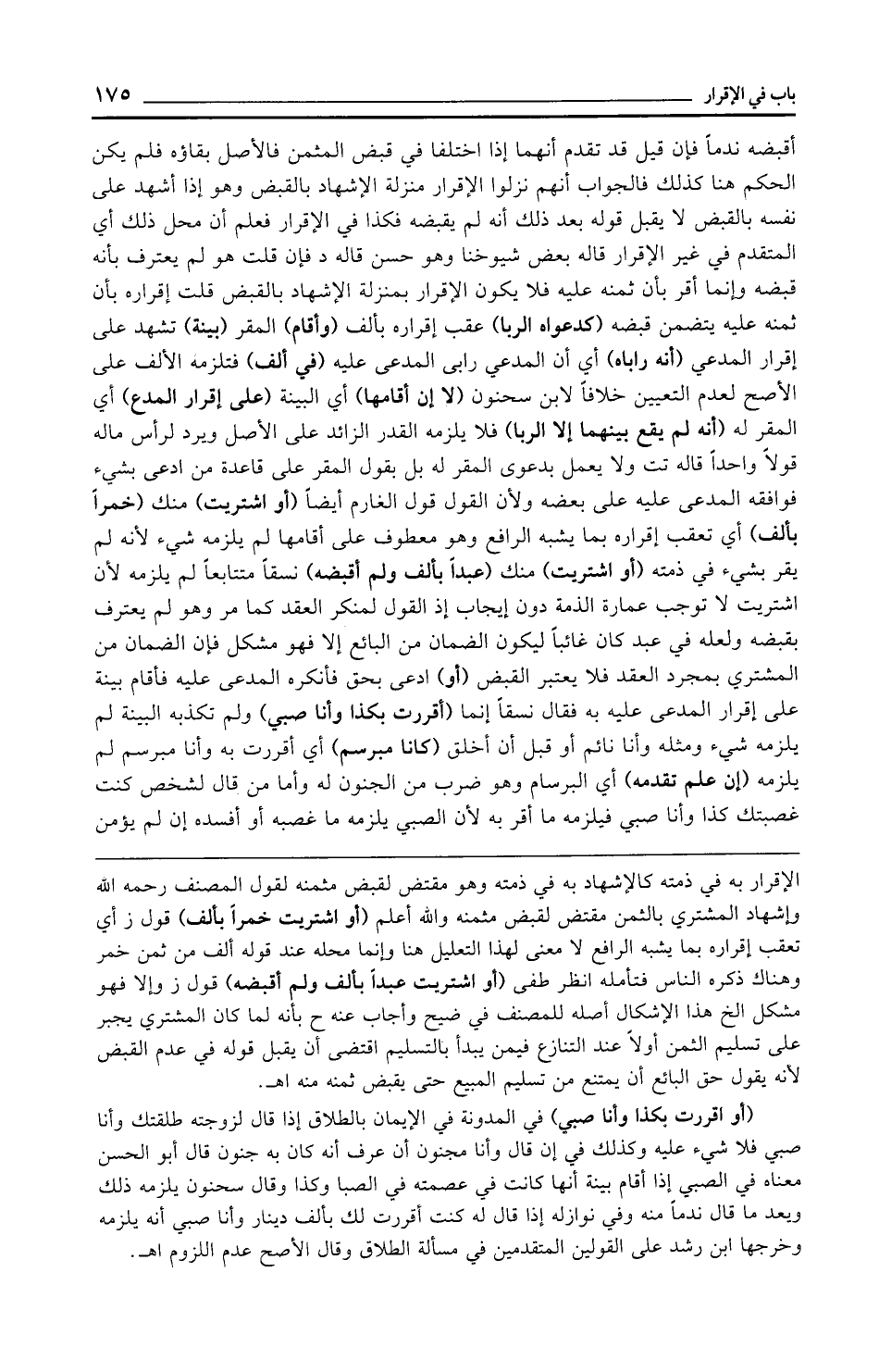 أقبضه ندمًا فإن قيل قد تقدم أنهما إذا اختلفا في قبض المثمن فالأصل بقاؤه فلم يكن الحكم هنا كذلك فالجواب أنهم نزلوا الإقرار منزلة الإشهاد بالقبض وهو إذا أشهد على نفسه بالقبض لا يقبل قوله بعد ذلك أنه لم يقبضه فكذا في الإقرار فعلم أن محل ذلك أي المتقدم في غير الإقرار قاله بعض شيوخنا وهو حسن قاله د فإن قلت هو لم يعترف بأنه قبضه وإنما أقر بأن ثمنه عليه فلا يكون الإقرار بمنزلة الإشهاد بالقبض قلت إقراره بأن ثمنه عليه يتضمن قبضه (كدعواه الربا) عقب إقراره بألف (وأقام) المقر (بينة) تشهد على إقرار المدعي (أنه راباه) أي أن المدعي رابى المدعى عليه (في ألف) فتلزمه الألف على الأصح لعدم التعيين خلافًا لابن سحنون (لا إن أقامها) أي البينة (على إقرار المدع) أي المقر له (أنه لم يقع بينهما إلا الربا) فلا يلزمه القدر الزائد على الأصل ويرد لرأس ماله قولًا واحدًا قاله تت ولا يعمل بدعوى المقر له بل بقول المقر على قاعدة من ادعى بشيء فوافقه المدعى عليه على بعضه ولأن القول قول الغارم أيضًا (أو اشتريت) منك (خمرًا بألف) أي تعقب إقراره بما يشبه الرافع وهو معطوف على أقامها لم يلزمه شيء لأنه لم يقر بشيء في ذمته (أو اشتريت) منك (عبدًا بألف ولم أقبضه) نسقًا متتابعًا لم يلزمه لأن اشتريت لا توجب عمارة الذمة دون إيجاب إذ القول لمنكر العقد كما مر وهو لم يعترف بقبضه ولعله في عبد كان غائبًا ليكون الضمان من البائع إلا فهو مشكل فإن الضمان من المشتري بمجرد العقد فلا يعتبر القبض (أو) ادعى بحق فأنكره المدعى عليه فأقام بينة على إقرار المدعى عليه به فقال نسقًا إنما (أقررت بكذا وأنا صبي) ولم تكذبه البينة لم يلزمه شيء ومثله وأنا نائم أو قبل أن أخلق (كانا مبرسم) أي أقررت به وأنا مبرسم لم يلزمه (إن علم تقدمه) أي البرسام وهو ضرب من الجنون له وأما من قال لشخص كنت غصبتك كذا وأنا صبي فيلزمه ما أقر به لأن الصبي يلزمه ما غصبه أو أفسده إن لم يؤمن