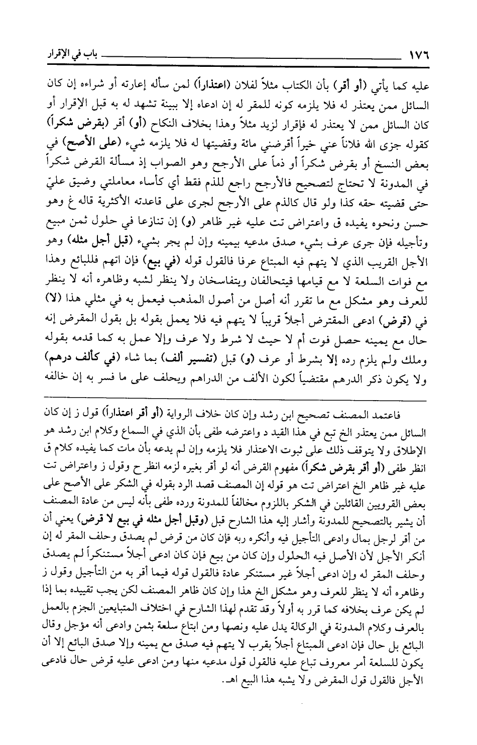 فاعتمد المصنف تصحيح ابن رشد وإن كان خلاف الرواية (أو أقر اعتذارًا) قول ز إن كان السائل ممن يعتذر الخ تبع في هذا القيد د واعترضه طفى بأن الذي في السماع وكلام ابن رشد هو الإطلاق ولا يتوقف ذلك على ثبوت الاعتذار فلا يلزمه وإن لم يدعه بأن مات كما يفيده كلام ق انظر طفى (أو أقر بقرض شكرًا) مفهوم القرض أنه لو أقر بغيره لزمه انظر ح وقول ز واعتراض تت عليه غير ظاهر الخ اعتراض تت هو قوله إن المصنف قصد الرد بقوله في الشكر على الأصح على بعض القرويين القائلين في الشكر باللزوم مخالفًا للمدونة ورده طفى بأنه ليس من عادة المصنف أن يشير بالتصحيح للمدونة وأشار إليه هذا الشارح قبل (وقبل أجل مثله في بيع لا قرض) يعني أن من أقر لرجل بمال وادعى التأجيل فيه وأنكره ربه فإن كان من قرض لم يصدق وحلف المقر له إن أنكر الأجل لأن الأصل فيه الحلول وإن كان من بيع فإن كان ادعى أجلًا مستنكرًا لم يصدق وحلف المقر له وإن ادعى أجلًا غير مستنكر عادة فالقول قوله فيما أقر به من التأجيل وقول ز وظاهره أنه لا ينظر للعرف وهو مشكل الخ هذا وإن كان ظاهر المصنف لكن يجب تقييده بما إذا لم يكن عرف بخلافه كما قرر به أولًا وقد تقدم لهذا الشارح في اختلاف المتبايعين الجزم بالعمل بالعرف وكلام المدونة في الوكالة يدل عليه ونصها ومن ابتاع سلعة بثمن وادعى أنه مؤجل وقال البائع بل حال فإن ادعى المبتاع أجلًا بقرب لا يتهم فيه صدق مع يمينه وإلا صدق البائع إلا أن يكون للسلعة أمر معروف تباع عليه فالقول قول مدعيه منها ومن ادعى عليه قرض حال فادعى الأجل فالقول قول المقرض ولا يشبه هذا البيع اهـ.