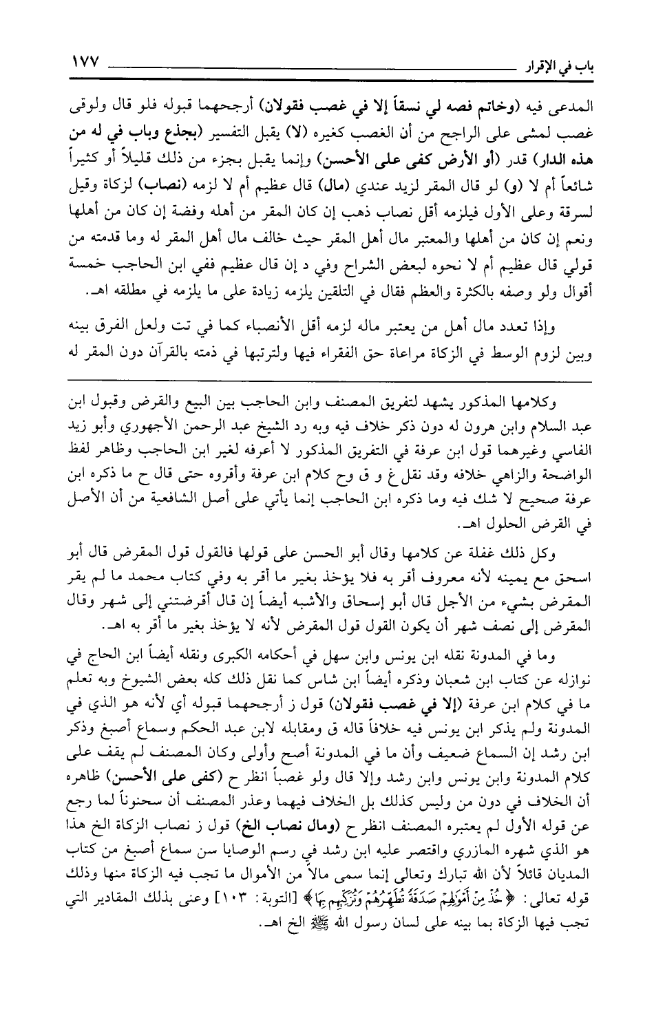 وما في المدونة نقله ابن يونس وابن سهل في أحكامه الكبرى ونقله أيضًا ابن الحاج في نوازله عن كتاب ابن شعبان وذكره أيضًا ابن شاس كما نقل ذلك كله بعض الشيوخ وبه تعلم ما في كلام ابن عرفة (إلا في غصب فقولان) قول ز أرجحهما قبوله أي لأنه هو الذي في المدونة ولم يذكر ابن يونس فيه خلافًا قاله ق ومقابله لابن عبد الحكم وسماع أصبغ وذكر ابن رشد إن السماع ضعيف وأن ما في المدونة أصح وأولى وكان المصنف لم يقف على كلام المدونة وابن يونس وابن رشد وإلا قال ولو غصبًا انظر ح (كفى على الأحسن) ظاهره أن الخلاف في دون من وليس كذلك بل الخلاف فيهما وعذر المصنف أن سحنونًا لما رجع عن قوله الأول لم يعتبره المصنف انظر ح (ومال نصاب الخ) قول ز نصاب الزكاة الخ هذا هو الذي شهره المازري واقتصر عليه ابن رشد في رسم الوصايا سن سماع أصبغ من كتاب المديان قائلًا لأن الله تبارك وتعالى إنما سمى مالًا من الأموال ما تجب فيه الزكاة منها وذلك قوله تعالى: {خُذْ مِنْ أَمْوَالِهِمْ صَدَقَةً تُطَهِّرُهُمْ وَتُزَكِّيهِمْ بِهَا} [التوبة: 103] وعنى بذلك المقادير التي تجب فيها الزكاة بما بينه على لسان رسول الله - صلى الله عليه وسلم - الخ اهـ.