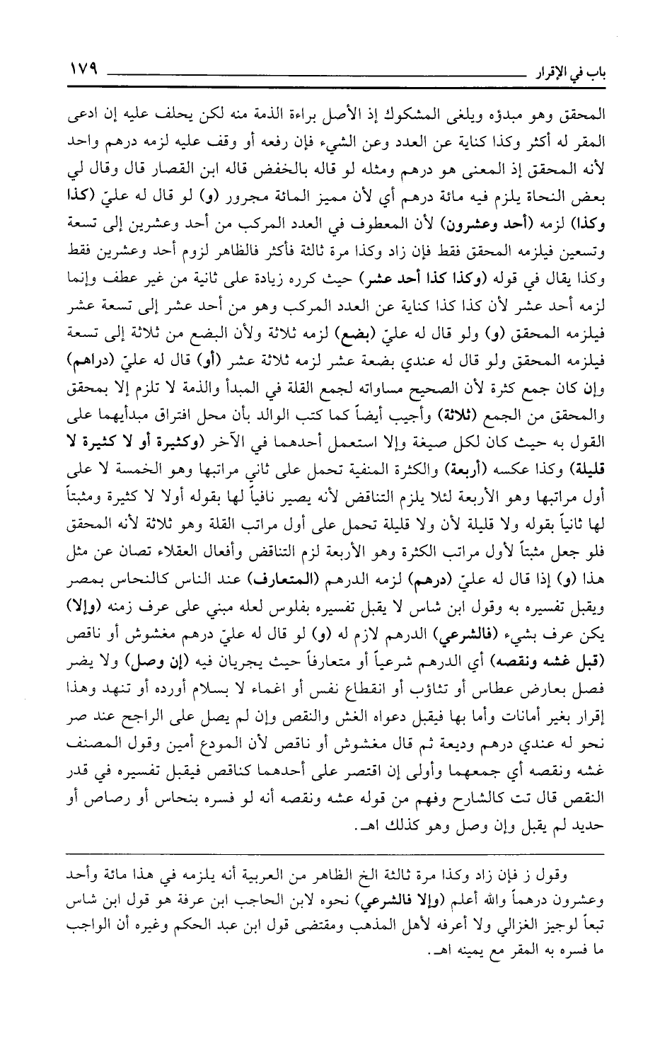 وقول ز فإن زاد وكذا مرة ثالثة الخ الظاهر من العربية أنه يلزمه في هذا مائة واحد وعشرون درهمًا والله أعلم (وإلا فالشرعي) نحوه لابن الحاجب ابن عرفة هو قول ابن شاس تبعًا لوجيز الغزالي ولا أعرفه لأهل المذهب ومقتضى قول ابن عبد الحكم وغيره أن الواجب ما فسره به المقر مع يمينه اهـ.