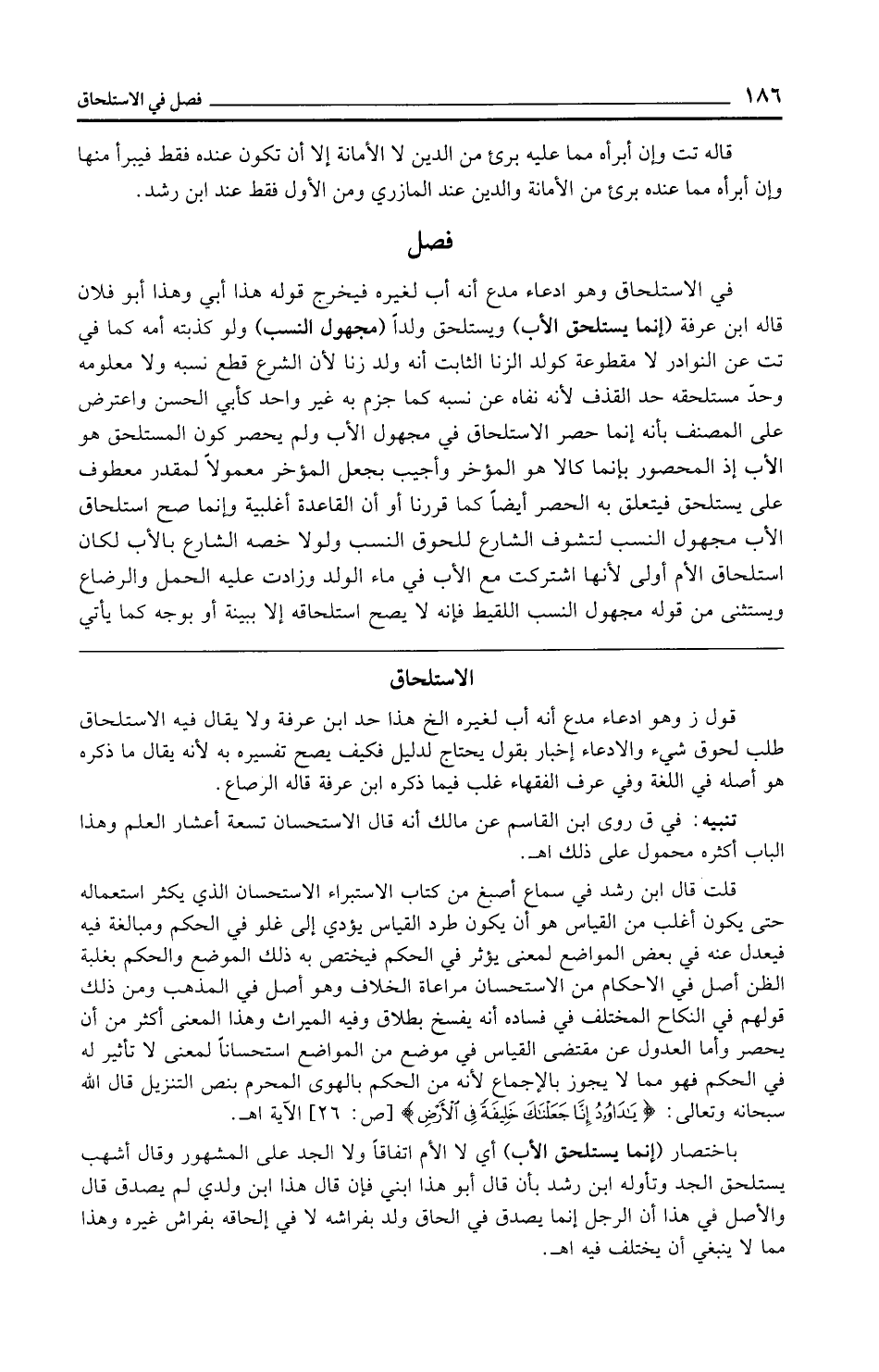 قول ز وهو ادعاء مدع أنه أب لغيره الخ هذا حد ابن عرفة ولا يقال فيه الاستلحاق طلب لحوق شيء والادعاء إخبار بقول يحتاج لدليل فكيف يصح تفسيره به لأنه يقال ما ذكره هو أصله في اللغة وفي عرف الفقهاء غلب فيما ذكره ابن عرفة قاله الرصاع.