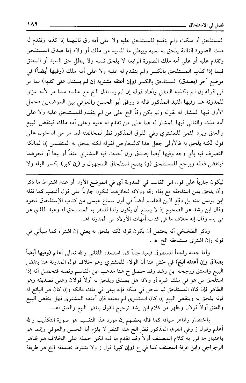 وأما جعله راجعًا للمنطوق فبعيد جدًّا كما استبعده اللقاني والله تعالى أعلم (وفيها أيضًا يصدّق وإن أعتقه الخ) في خش هنا أن الولاء للمشتري وهو خلاف قول المدونة هنا ينقض البيع والعتق ورجحه ابن رشد وقد حصل ح هنا مذهب ابن القاسم ونصه فتحصل أنه إذا استلحق من هو في ملك غيره أو ولائه هل يصدق ويلحق به أولًا قولان وعلى تصديقه وهو الظاهر فإن كان المستلحق لم يدخل في ملكه فإنه يبقى في ملك مالكه وإن كان هو البائع له فإنه يلحق به وينقض البيع إن كان المشتري لم يعتقه فإن أعتقه المشتري فهل ينقض البيع والعتق أولًا قولان ويظهر من كلام ابن رشد ترجيح القول بنقض البيع والعتق اهـ.
