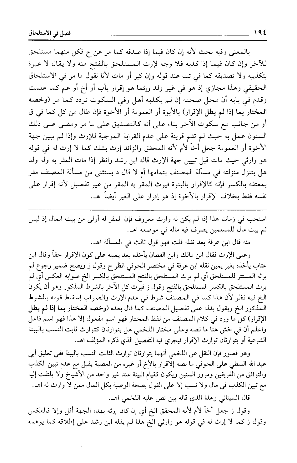 وهو قصور فإن النقل عن اللخمي أنهما يتوارثان توارث الثابت النسب بالبينة ففي تعليق أبي عبد الله السطي على الحوفي ما نصه الإقرار بالأخ أو غيره من العصبة يقبل مع عدم تبين الكذب والتوافق من الفريقين ومرور السنين ويكون كقيام البينة عند غير واحد من الأشياخ ولا يلتفت إليه مع تبين الكذب في مال ولا نسب إلا على القول بصحة الوصية بكل المال ممن لا وارث له اهـ.