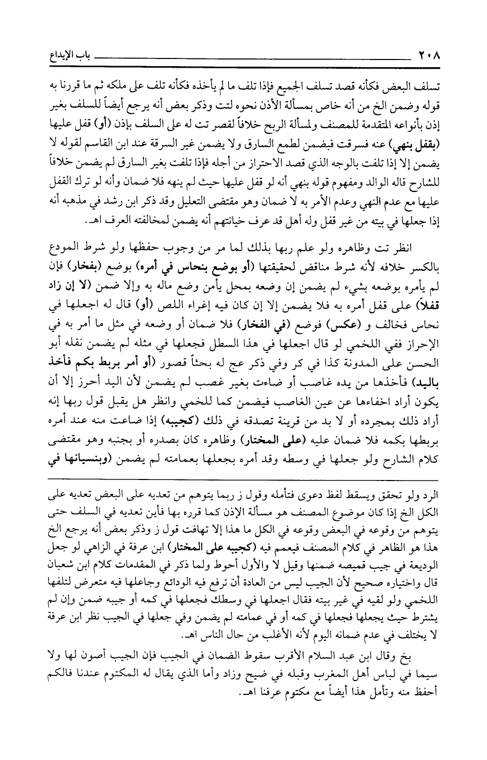 بخ وقال ابن عبد السلام الأقرب سقوط الضمان في الجيب فإن الجيب أصون لها ولا سيما في لباس أهل المغرب وقبله في ضيح وزاد وأما الذي يقال له المكتوم عندنا فالكم أحفظ منه وتأمل هذا أيضًا مع مكتوم عرفنا اهـ.