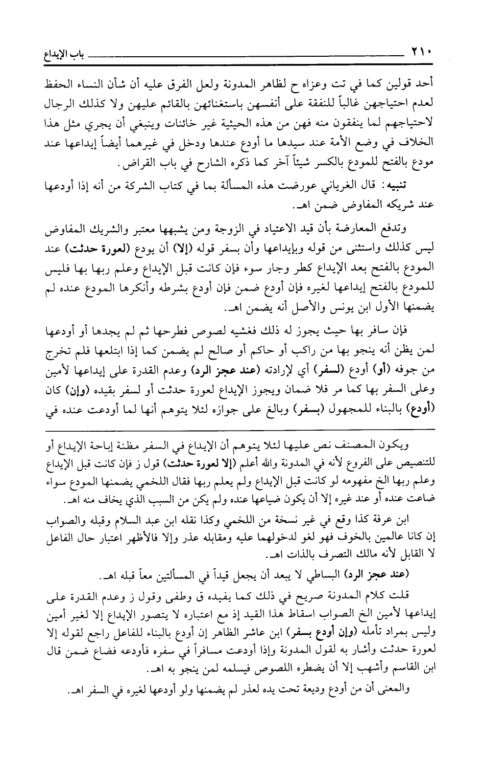 وتدفع المعارضة بأن قيد الاعتياد في الزوجة ومن يشبهها معتبر والشريك المفاوض ليس كذلك واستثنى من قوله وبإيداعها وأن بسفر قوله (إلا) أن يودع (لعورة حدثت) عند المودع بالفتح بعد الإيداع كطر وجار سوء فإن كانت قبل الإيداع وعلم ربها بها فليس للمودع بالفتح إيداعها لغيره فإن أودع ضمن فإن أودع بشرطه وأنكرها المودع عنده لم يضمنها الأول ابن يونس والأصل أنه يضمن اهـ.