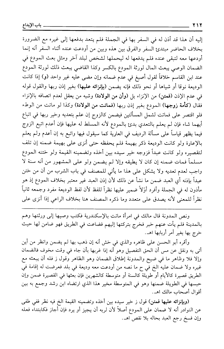 إليه أن هذا قد أذن له في السفر بها في الجملة فلم يتعد بدفعها إلى غيره مع الضرورة بخلاف الحاضر مبتدئ السفر والفرق بين هذه وبين من أودعت عنده أثناء السفر أنه إنما أودعها معه لتبقى عنده فلم يدفعها له ليحملها لشخص لبلد آخر ومثل بعث المودع في الضمان الوصي يبعث المال لورثة المودع بالكسر وكذا القاضي يبعث ذلك لورثة المودع عند ابن القاسم خلافًا لقول أصبغ في عدم ضمانه وإن مضى عليه غير واحد (و) إذا كانت الوديعة نوقا أو شياها أو نحو ذلك فإنه يضمن (بإنزائه عليها) بغير إذن ربها والقول قوله في عدم الإذن (فمتن) من الإنزاء بل (وأن من الولادة) وشبه من يعقل لعدم اتصافه بالإنزاء فقال (كأمة زوجها) المودع بغير إذن ربها (فماتت من الولادة) وكذا لو ماتت من الوطء فلو اقتصر على فماتت لشمل المسألتين فيضمن كالزوج إن علم بتعديه وخير ربها في اتباع أيهما شاء فإن لم يعلم بالتعدي بدئ بالمودع لأنه المسلط له عليها فإن أعدم اتبع الزوج فيما يظهر قياسًا على مسألة الرديف في العارية كما سيقول فيها واتبع به إن أعدم ولم يعلم بالإعارة ولو كانت الوديعة ذكر بهيمة فلم يحفظه حتى أنزى على بهيمة ضمنه إن تلف لتقصيره ولو كانت عبدًا فزوجه خير سيده بين أخذه وتضمينه القيمة ولو ختنه المودع مسلمًا فمات ضمنه إن كان لا يطيقه وإلا لم يضمن ولو على المشهور من أنه سنة لا واجب لعدم تعديه ولا يشكل على هذا ما يأتي للمصنف في باب الشرب من أن من ختن عبدًا بإذنه أي العبد ضمن ما نشأ عن ذلك لأن إذن العبد غير معتبر بخلاف المودع إذ هو مأذون له في الجملة وأفرد أوّلًا ضمير عليها نظرًا للفظ لأن لفظ الوديعة مفرد وجمعه ثانيًا نظرًا للمعنى لأنه يصدق على متعدد وما ذكره المصنف هنا بخلاف الراعي إذا أنزى على