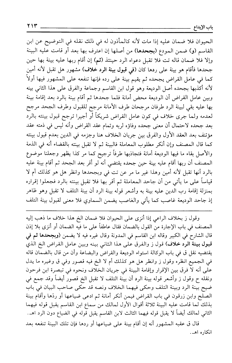 الحيوان فلا ضمان عليه إذا مات لأنه كالمأذون له في ذلك نقله في التوضيح عن ابن القاسم (و) ضمن المودع (بجحدها) من أصلها إن اعترف بها بعد أو قامت عليه البينة وإن فلا ضمان قاله تت فلا تقبل دعواه الرد حينئذ (ثم) إن أقام ربها عليه بينة بها حين جحدها فأقام هو بينة على ردها كان (في قبول بينة الرد خلاف) مشهور هل تقبل لأنه أمين كما في عامل القراض يجحده ثم يقيم بينة على رده فإنها تنفعه على المشهور فيها أولًا لأنه أكذبها بجحده أصل الوديعة وهو قول ابن القاسم وجماعة والفرق على هذا الثاني بينه وبين عامل القراض أن الوديعة محض أمانة فلما جحدها ثم أقام بينة بالرد بعد إقامة بينة بها عليه بقي لبينة الرد طرفان مرجحان طرف الأمانة مرجح للقبول وطرف الجحد مرجح لعدمه ولما جرى خلاف في كون عامل القراض شريكًا أو أجيرا ترجح قبول بينته بالرد بعد جحده لاحتمال أن معنى جحده وفاؤه لربه وتمام عقد القراض وأنه ليس في ذمته عقد مؤتنف بعد العقد الأول والفرق بين جريان الخلاف هنا وجزمه في الدين بعدم قبول بينته كما قال المصنف وإن أنكر مطلوب المعاملة فالبينة ثم لا تقبل بينته بالقضاء أنه في الذمة والأصل بقاء ما فيها الوديعة أمانة فتجاذبها طرفًا ترجيح كما مر كذا يظهر وجعلنا موضوع المصنف أن ربها أقام عليه بينة حين جحده يقتضي أنه لو أقر بعد الجحد ثم أقام بينة عليه بالرد أنها تقبل لأنه أمين وهذا غير ما مر عن تت في وبجحدها وانظر هل هو كذلك أم لا قياسًا على ما يأتي من أن جاحد المعاملة ثم أقر بها فلا تقبل بينته بالرد فجعلوا إقراره بمنزلة إقامة رب الدين عليه بينة به وأشعر قوله بينة الرد أن بينة التلف لا تقبل وهو ظاهر إذ جاحد الوديعة غاصب كما يأتي والغاصب يضمن السماوي فلا معنى لقبول بينة التلف