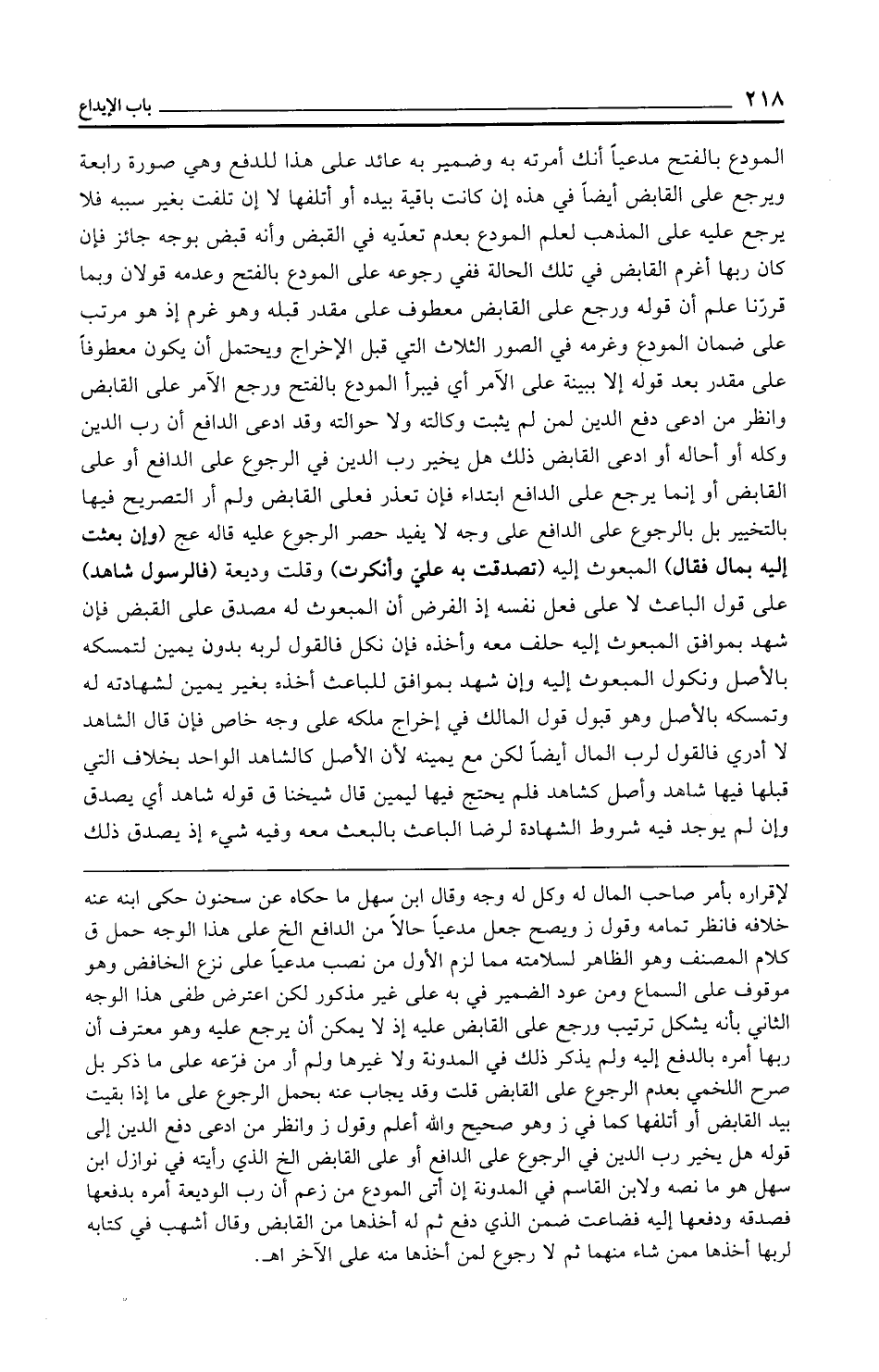 المودع بالفتح مدعيًا أنك أمرته به وضمير به عائد على هذا للدفع وهي صورة رابعة ويرجع على القابض أيضًا في هذه إن كانت باقية بيده أو أتلفها لا إن تلفت بغير سببه فلا يرجع عليه على المذهب لعلم المودع بعدم تعدّيه في القبض وأنه قبض بوجه جائز فإن كان ربها أغرم القابض في تلك الحالة ففي رجوعه على المودع بالفتح وعدمه قولان وبما قررّنا علم أن قوله ورجع على القابض معطوف على مقدر قبله وهو غرم إذ هو مرتب على ضمان المودع وغرمه في الصور الثلاث التي قبل الإخراج ويحتمل أن يكون معطوفًا على مقدر بعد قوله إلا ببينة على الآمر أي فيبرأ المودع بالفتح ورجع الآمر على القابض وانظر من ادعى دفع الدين لمن لم يثبت وكالته ولا حوالته وقد ادعى الدافع أن رب الدين وكله أو أحاله أو ادعى القابض ذلك هل يخير رب الدين في الرجوع على الدافع أو على القابض أو إنما يرجع على الدافع ابتداء فإن تعذر فعلى القابض ولم أر التصريح فيها بالتخيير بل بالرجوع على الدافع على وجه لا يفيد حصر الرجوع عليه قاله عج (وإن بعثت إليه بمال فقال) المبعوث إليه (تصدقت به عليّ وأنكرت) وقلت وديعة (فالرسول شاهد) على قول الباعث لا على فعل نفسه إذ الفرض أن المبعوث له مصدق على القبض فإن شهد بموافق المبعوث إليه حلف معه وأخذه فإن نكل فالقول لربه بدون يمين لتمسكه بالأصل ونكول المبعوث إليه وإن شهد بموافق للباعث أخذث بغير يمين لشهادته له وتمسكه بالأصل وهو قبول قول المالك في إخراج ملكه على وجه خاص فإن قال الشاهد لا أدري فالقول لرب المال أيضًا لكن مع يمينه لأن الأصل كالشاهد الواحد بخلاف التي قبلها فيها شاهد وأصل كشاهد فلم يحتج فيها ليمين قال شيخنا ق قوله شاهد أي يصدق وإن لم يوجد فيه شروط الشهادة لرضا الباعث بالبعث معه وفيه شيء إذ يصدق ذلك