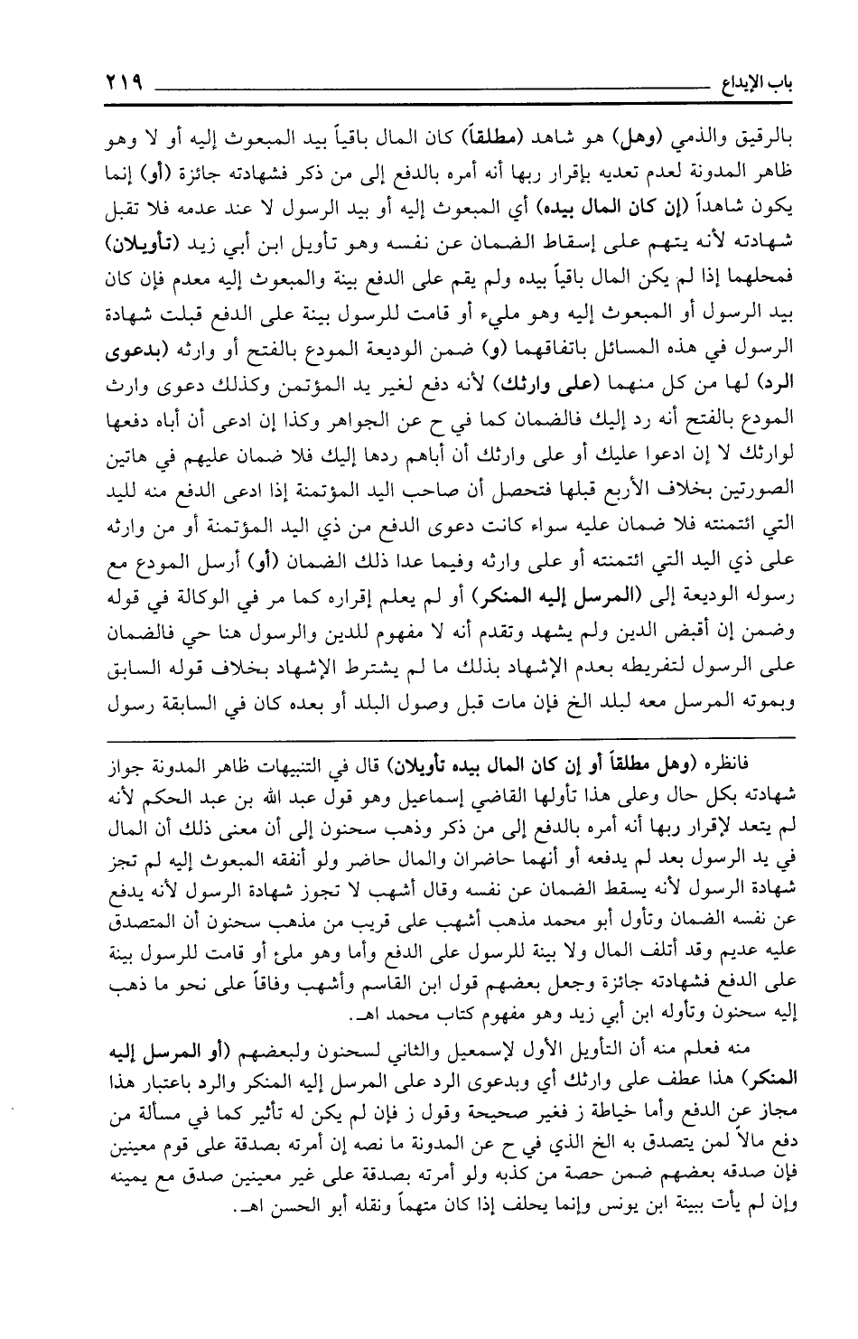 بالرقيق والذمي (وهل) هو شاهد (مطلقًا) كان المال باقيًا بيد المبعوث إليه أو لا وهو ظاهر المدونة لعدم تعديه بإقرار ربها أنه أمره بالدفع إلى من ذكر فشهادته جائزة (أو) إنما يكون شاهدًا (وإن كان المال بيده) أي المبعوث إليه أو بيد الرسول لا عند عدمه فلا تقبل شهادته لأنه يتهم على إسقاط الضمان عن نفسه وهو تأويل ابن أبي زيد (تأويلان) فمحلهما إذا لم يكن المال باقيًا بيده ولم يقم على الدفع بينة والمبعوث إليه معدم فإن كان بيد الرسول أو المبعوث إليه وهو مليء أو قامت للرسول بينة على الدفع قبلت شهادة الرسول في هذه المسائل باتفاقهما (و) ضمن الوديعة المودع بالفتح أو وارثه (بدعوى الرد) لها من كل منهما (على وارثك) لأنه دفع لغير يد المؤتمن وكذلك دعوى وارث المودع بالفتح أنه رد إليك فالضمان كما في ح عن الجواهر وكذا إن ادعى أن أباه دفعها لوارثك لا إن ادعوا عليك أو على وارثك أن أباهم ردها إليك فلا ضمان عليهم في هاتين الصورتين بخلاف الأربع قبلها فتحصل أن صاحب اليد المؤتمنة إذا ادعى الدفع منه لليد التي ائتمنته فلا ضمان عليه سواء كانت دعوى الدفع من ذي اليد المؤتمنة أو من وارثه على ذي اليد التي ائتمنته أو على وارثه وفيما عدا ذلك الضمان (أو) أرسل المودع مع رسوله الوديعة إلى (المرسل إليه المنكر) أو لم يعلم إقراره كما مر في الوكالة في قوله وضمن إن أقبض الدين ولم يشهد وتقدم أنه لا مفهوم للدين والرسول هنا حي فالضمان على الرسول لتفريطه بعدم الإشهاد بذلك ما لم يشترط الإشهاد بخلاف قوله السابق وبموته المرسل معه لبلد الخ فإن مات قبل وصول البلد أو بعده كان في السابقة رسول