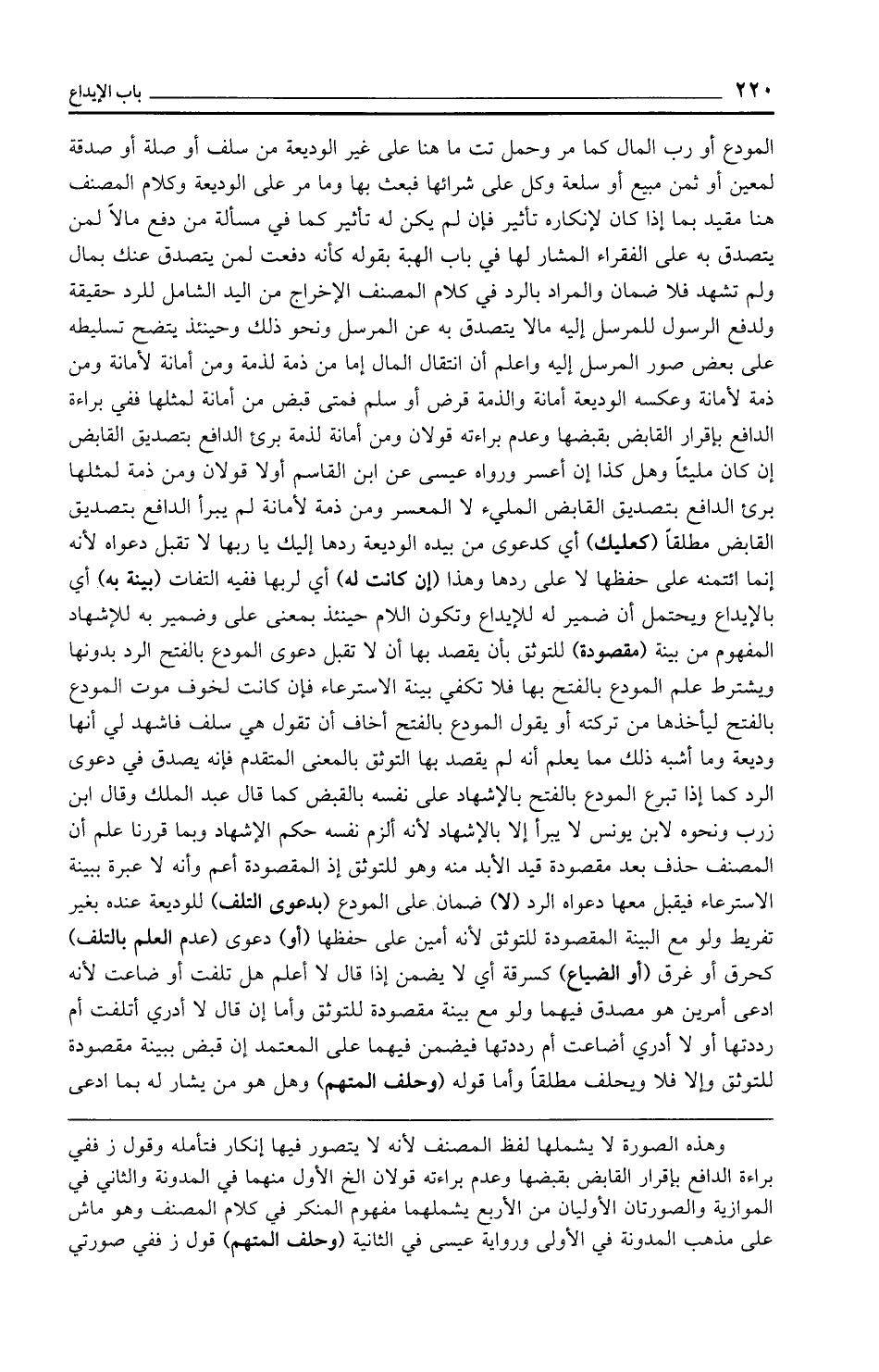 المودع أو رب المال كما مر وحمل تت ما هنا على غير الوديعة من سلف أو صلة أو صدقة لمعين أو ثمن مبيع أو سلعة وكل على شرائها فبعث بها وما مر على الوديعة وكلام المصنف هنا مقيد بما إذا كان لإنكاره تأثير فإن لم يكن له تأثير كما في مسألة من دفع مالًا لمن يتصدق به على الفقراء المشار لها في باب الهبة بقوله كأنه دفعت لمن يتصدق عنك بمال ولم تشهد فلا ضمان والمراد بالرد في كلام المصنف الإخراج من اليد الشامل للرد حقيقة ولدفع الرسول للمرسل إليه مالًا يتصدق به عن المرسل ونحو ذلك وحينئذ يتضح تسليطه على بعض صور المرسل إليه واعلم أن انتقال المال إما من ذمة لذمة ومن أمانة لأمانة ومن ذمة لأمانة وعكسه الوديعة أمانة والذمة قرض أو سلم فمتى قبض من أمانة لمثلها ففي براءة الدافع بإقرار القابض بقبضها وعدم براءته قولان ومن أمانة لذمة برئ الدافع بتصديق القابض إن كان مليئًا وهل كذا إن أعسر ورواه عيسى عن ابن القاسم أولًا قولان ومن ذمة لمثلها برئ الدافع بتصديق القابض المليء لا المعسر ومن ذمة لأمانة لم يبرأ الدافع بتصديق القابض مطلقًا (كعليك) أي كدعوى من بيده الوديعة ردها إليك يا ربها لا تقبل دعواه لأنه إنما ائتمنه على حفظها لا على ردها وهذا (إن كانت له) أي لربها ففيه التفات (بينة به) أي بالإيداع ويحتمل أن ضمير له للإيداع وتكون اللام حينئذ بمعنى على وضمير به للإشهاد المفهوم من بينة (مقصودة) للتوثق بأن يقصد بها أن لا تقبل دعوى المودع بالفتح الرد بدونها ويشترط علم المودع بالفتح بها فلا تكفي بينة الاسترعاء فإن كانت لخوف موت المودع بالفتح ليأخذها من تركته أو يقول المودع بالفتح أخاف أن تقول هي سلف فاشهد لي أنها وديعة وما أشبه ذلك مما يعلم أنه لم يقصد بها التوثق بالمعنى المتقدم فإنه يصدق في دعوى الرد كما إذا تبرع المودع بالفتح بالإشهاد على نفسه بالقبض كما قال عبد الملك وقال ابن زرب ونحوه لابن يونس لا يبرأ إلا بالإشهاد لأنه ألزم نفسه حكم الإشهاد وبما قررنا علم أن المصنف حذف بعد مقصودة قيد الأبد منه وهو للتوثق إذ المقصودة أعم وأنه لا عبرة ببينة الاسترعاء فيقبل معها دعواه الرد (لا) ضمان على المودع (بدعوى التلف) للوديعة عنده بغير تفريط ولو مع البينة المقصودة للتوثق لأنه أمين على حفظها (أو) دعوى (عدم العلم بالتلف) كحرق أو غرق (أو الضياع) كسرقة أي لا يضمن إذا قال لا أعلم هل تلفت أو ضاعت لأنه ادعى أمرين هو مصدق فيهما ولو مع بينة مقصودة للتوثق وأما إن قال لا أدري أتلفت أم رددتها أو لا أدري أضاعت أم رددتها فيضمن فيهما على المعتمد إن قبض ببينة مقصودة للتوثق وإلا فلا ويحلف مطلقًا وأما قوله (وحلف المتهم) وهل هو من يشار له بما ادعى