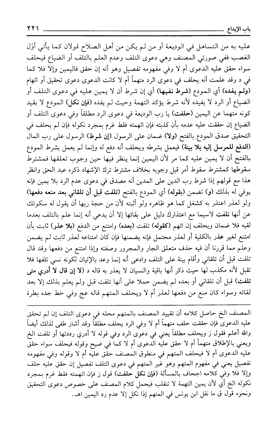عليه به من التساهل في الوديعة أو من لم يكن من أهل الصلاح قولان كما يأتي أوّل الغصب ففي صورتي المصنف وهي دعوى التلف وعدم العلم بالتلف أو الضياع فيحلف سواء حقق عليه الدعوى أم لا وفي مفهومه تفصيل وهو أنه إن حقق فاليمين وإلا فلا كما في د وقد علمت أنه يحلف في دعوى الرد متهمًا أم لا كانت الدعوى دعوى تحقيق أو اتهام (ولم يفده) أي المودع (شرط نفيها) أي إن شرط أن لا يمين عليه في دعوى التلف أو الضياع أو الرد لا يفيده لأنه شرط يؤكد التهمة وحيث لم يفده (فإن نكل) المودع لا بقيد كونه متهما عن اليمين (حلفت) يا رب الوديعة في دعوى الرد مطلقًا وفي دعوى التلف أو الضياع إن حققت عليه عدمه بأن كذبته فإن اتهمته فقط غرم بمجرد نكوله فإن لم يحلف في التحقيق صدق المودع بالفتح (ولا) ضمان على الرسول (إن شرط) الرسول على رب المال (الدفع للمرسل إليه بلا بينة) فيعمل بشرطه ويحلف أنه دفع له وإنما لم يعمل بشرط المودع بالفتح أن لا يمين عليه كما مر لأن اليمين إنما ينظر فيها حين وجوب تعلقها فمشترط سقوطها كمشترط سقوط أمر قبل وجوبه بخلاف مشترط ترك الإشهاد ذكره عبد الحق وانظر هذا مع قولهم إذا شرط رب الدين على المدين أنه مصدق في دعوى عدم الرد بلا يمين فإنه يوفي له بذلك (و) تضمن (بقوله) أي المودع بالفتح (تلفت قبل أن تلقاني بعد منعه دفعها) ولو لعذر اعتذر به كشغل كما هو ظاهره ولو أثبته لأن من حجة ربها أن يقول له سكوتك عن أنها تلفت لا سيما مع اعتذارك دليل على بقائها إلا أن يدعي أنه إنما علم بالتلف بعد ما لقيه فلا ضمان ويحلف إن اتهم (كقوله) تلفت (بعده) وامتنع من الدفع (بلا عذر) ثابت بأن امتنع لغير عذر بالكلية أو لعذر محتمل فإنه يضمنها فإن كان امتناعه لعذر ثابت لم يضمن وعلم مما قررنا أن فيه حذف متعلق الجار والمجرور وصفته وإذا امتنع من دفعها وقد قال تلفت قبل أن تلقاني وأقام بينة على التلف وادعى أنه إنما وعد بالإتيان لكونه نسي تلفها فلا تقبل لأنه مكذب لها حيث ذكر أنها باقية والنسيان لا يعذر به قاله د (لا إن قال لا أدري متى تلفت) قبل أن تلقاني أو بعده لم يضمن حملا على أنها تلفت قبل ولم يعلم بذلك إلا بعد لقائه وسواء كان منع من دفعها لعذر أم لا ويحلف المتهم قاله عج وفي خط جده بطرة