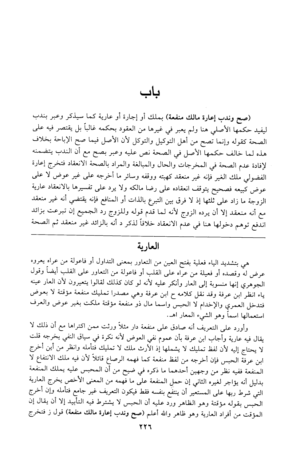 وأورد على التعريف أنه صادق على منفعة دار مثلًا ورثت ممن اكتراها مع أن ذلك لا يقال فيه عارية وأجاب ابن عرفة بأن عموم نفي العوض لأنه نكرة في سياق النفي يخرجه قلت لا يحتاج إليه لأن لفظ تمليك لا يشملها إذ الأرث ملك لا تمليك فتأمله وانظر من أين أخرج ابن عرفة الحبس فإن أخرجه من لفظ منفعة كما فهمه الرصاع قائلًا لأن فيه ملك الانتفاع لا المنفعة ففيه نظر من وجهين أحدهما ما ذكره في ضيح من أن المحبس عليه يملك المنفعة بدليل أنه يؤاجر لغيره الثاني إن حمل المنفعة على ما فهمه من المعنى الأخص يخرج العارية التي شرط ربها على المستعير أن ينتفع بنفسه فقط فيكون التعريف غير جامع فتأمله وإن أخرج الحبس بقوله مؤقتة وهو الظاهر ورد عليه أن الحبس لا يشترط فيه التأبيد إلا أن يقال إن المؤقت من أفراد العارية وهو ظاهر والله أعلم (صح وندب إعارة مالك منفعة) قول ز فتخرج
