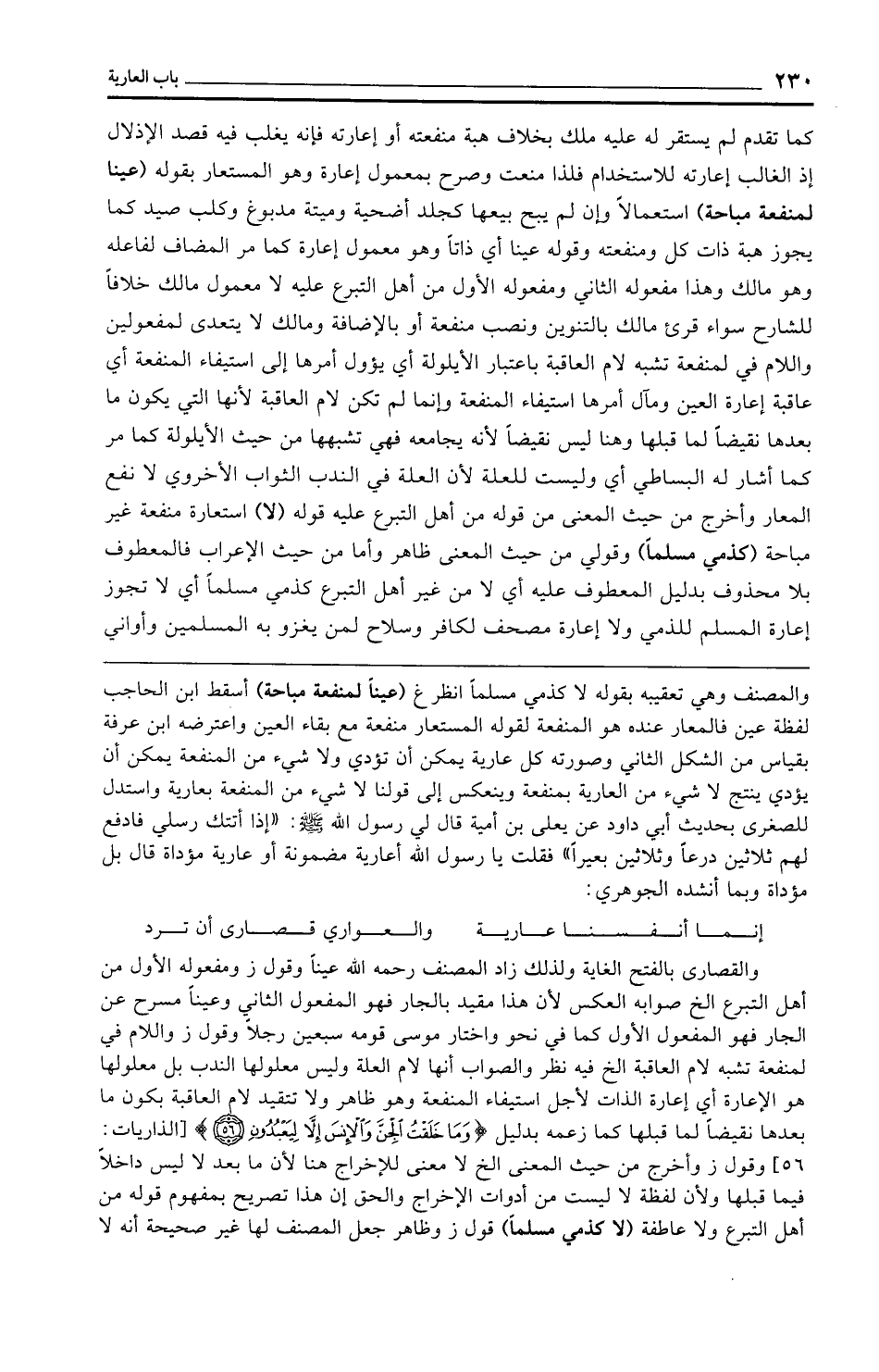 والمصنف وهي تعقيبه بقوله لا كذمي مسلمًا انظر غ (عينًا لمنفعة مباحة) أسقط ابن الحاجب لفظة عين فالمعار عنده هو المنفعة لقوله المستعار منفعة مع بقاء العين واعترضه ابن عرفة بقياس من الشكل الثاني وصورته كل عارية يمكن أن تؤدي ولا شيء من المنفعة يمكن أن يؤدي ينتج لا شيء من العارية بمنفعة وينعكس إلى قولنا لا شيء من المنفعة بعارية واستدل للصغرى بحديث أبي داود عن يعلى بن أمية قال لي رسول الله - صلى الله عليه وسلم -: "إذا أتتك رسلي فادفع لهم ثلاثين درعًا وثلاثين بعيرًا" فقلت يا رسول الله أعارية مضمونة أو عارية مؤداة قال بل مؤداة وبما أنشده الجوهري: