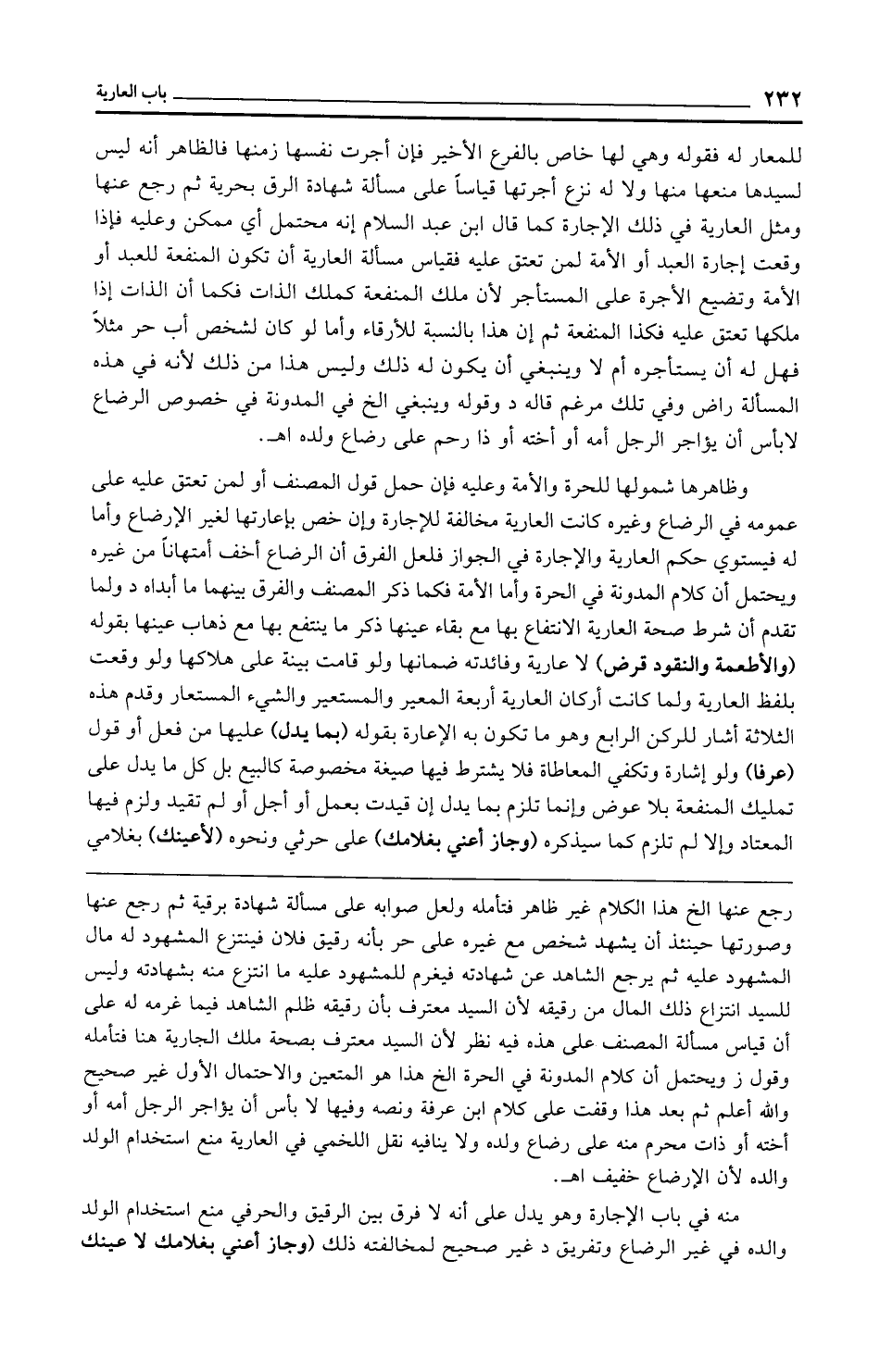 وظاهرها شمولها للحرة والأمة وعليه فإن حمل قول المصنف أو لمن تعتق عليه على عمومه في الرضاع وغيره كانت العارية مخالفة للإجارة وإن خص بإعارتها لغير الإرضاع وأما له فيستوي حكم العارية والإجارة في الجواز فلعل الفرق أن الرضاع أخف امتهانًا من غيره ويحتمل أن كلام المدونة في الحرة وأما الأمة فكما ذكر المصنف والفرق بينهما ما أبداه د ولما تقدم أن شرط صحة العارية الانتفاع بها مع بقاء عينها ذكر ما ينتفع بها مع ذهاب عينها بقوله (والأطعمة والنقود قرض) لا عارية وفائدته ضمانها ولو قامت بينة على هلاكها ولو وقعت بلفظ العارية ولما كانت أركان العارية أربعة المعير والمستعير والشيء المستعار وقدم هذه الثلاثة أشار للركن الرابع وهو ما تكون به الإعارة بقوله (بما يدل) عليها من فعل أو قول (عرفا) ولو إشارة وتكفي المعاطاة فلا يشترط فيها صيغة مخصوصة كالبيع بل كل ما يدل على تمليك المنفعة بلا عوض وإنما تلزم بما يدل إن قيدت بعمل أو أجل أو لم تقيد ولزم فيها المعتاد وإلا لم تلزم كما سيذكره (وجاز أعني بغلامك) على حرثي ونحوه (لأعينك) بغلامي