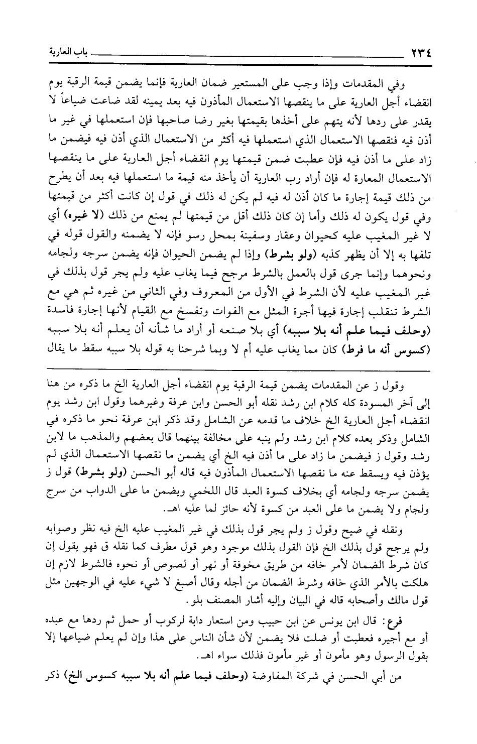 وقول ز عن المقدمات يضمن قيمة الرقبة يوم انقضاء أجل العارية الخ ما ذكره من هنا إلى آخر المسودة كله كلام ابن رشد نقله أبو الحسن وابن عرفة وغيرهما وقول ابن رشد يوم انقضاء أجل العارية الخ خلاف ما قدمه عن الشامل وقد ذكر ابن عرفة نحو ما ذكره في الشامل وذكر بعده كلام ابن رشد ولم ينبه على مخالفة بينهما قال بعضهم والمذهب ما لابن رشد وقول ز فيضمن ما زاد على ما أذن فيه الخ أي يضمن ما نقصها الاستعمال الذي لم يؤذن فيه ويسقط عنه ما نقصها الاستعمال المأذون فيه قاله أبو الحسن (ولو بشرط) قول ز يضمن سرجه ولجامه أي بخلاف كسوة العبد قال اللخمي ويضمن ما على الدواب من سرج ولجام ولا يضمن ما على العبد من كسوة لأنه حائز لما عليه اهـ.