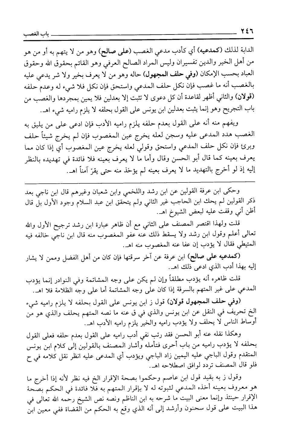 الدابة لذلك (كمدعيه) أي كأدب مدعي الغصب (على صالح) وهو من لا يتهم به أو من هو من أهل الخير والدين تفسيران وليس المراد الصالح العرفي وهو القائم بحقوق الله وحقوق العباد بحسب الإمكان (وفي حلف المجهول) حاله وهو من لا يعرف بخير ولا شر يدعي عليه بالغصب أنه ما غصب فإن نكل حلف المدعي واستحق فإن نكل فلا شيء له وعدم حلفه (قولان) والثاني أظهر لقاعدة أن كل دعوى لا تثبت إلا بعدلين فلا يمين بمجردها والغصب من باب التجريح وهو إنما يثبت بعدلين ابن يونس على القول بحلفه لا يلزم راميه شيء اهـ.