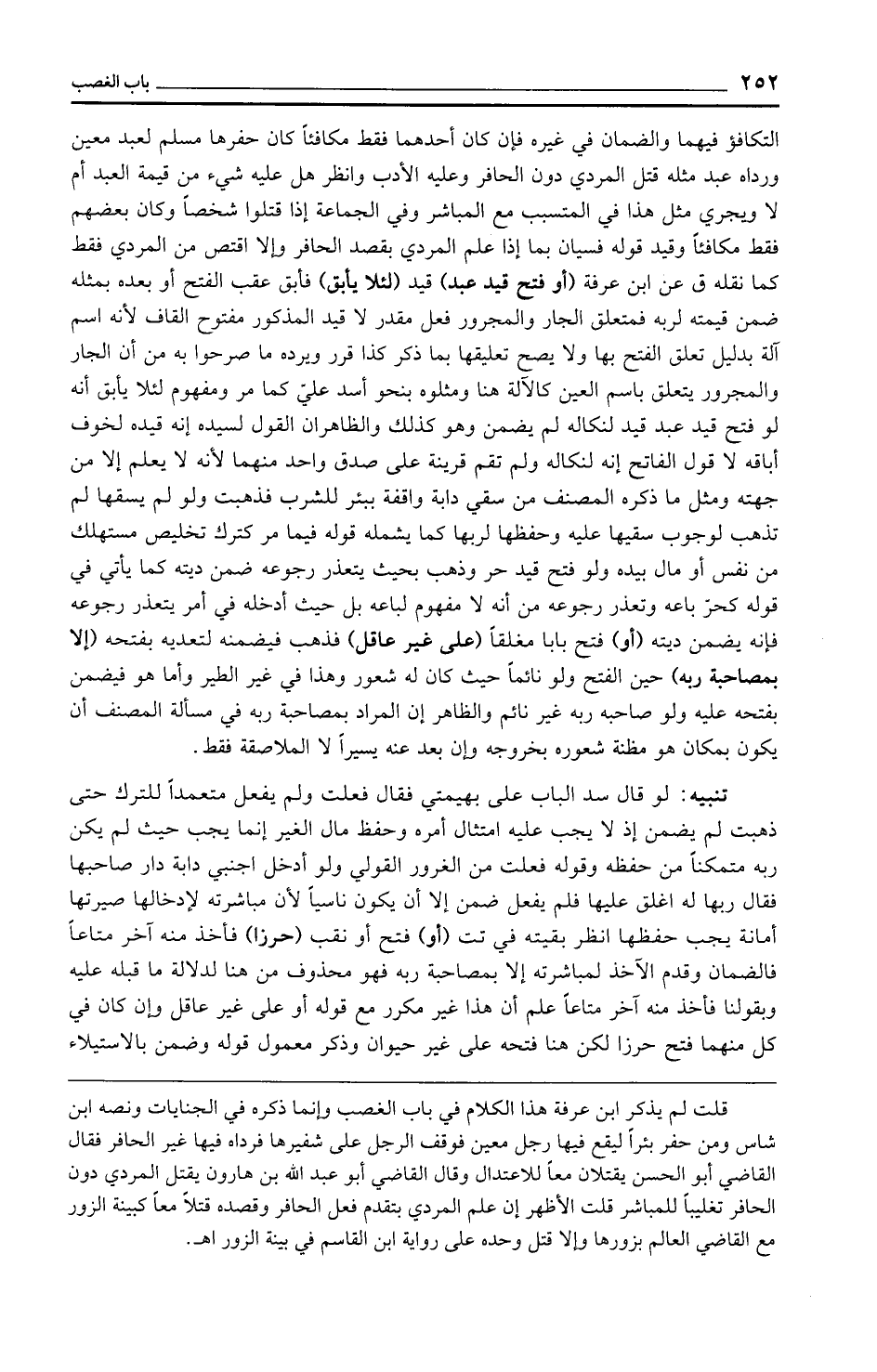 قلت لم يذكر ابن عرفة هذا الكلام في باب الغصب وإنما ذكره في الجنايات ونصه ابن شاس ومن حفر بئرًا ليقع فيها رجل معين فوقف الرجل على شفيرها فرداه فيها غير الحافر فقال القاضي أبو الحسن يقتلان معًا للاعتدال وقال القاضي أبو عبد الله بن هارون يقتل المردي دون الحافر تغليبًا للمباشر قلت الأظهر إن علم المردي بتقدم فعل الحافر وقصده قتلا معًا كبينة الزور مع القاضي العالم بزورها وإلا قتل وحده على رواية ابن القاسم في بينة الزور اهـ.