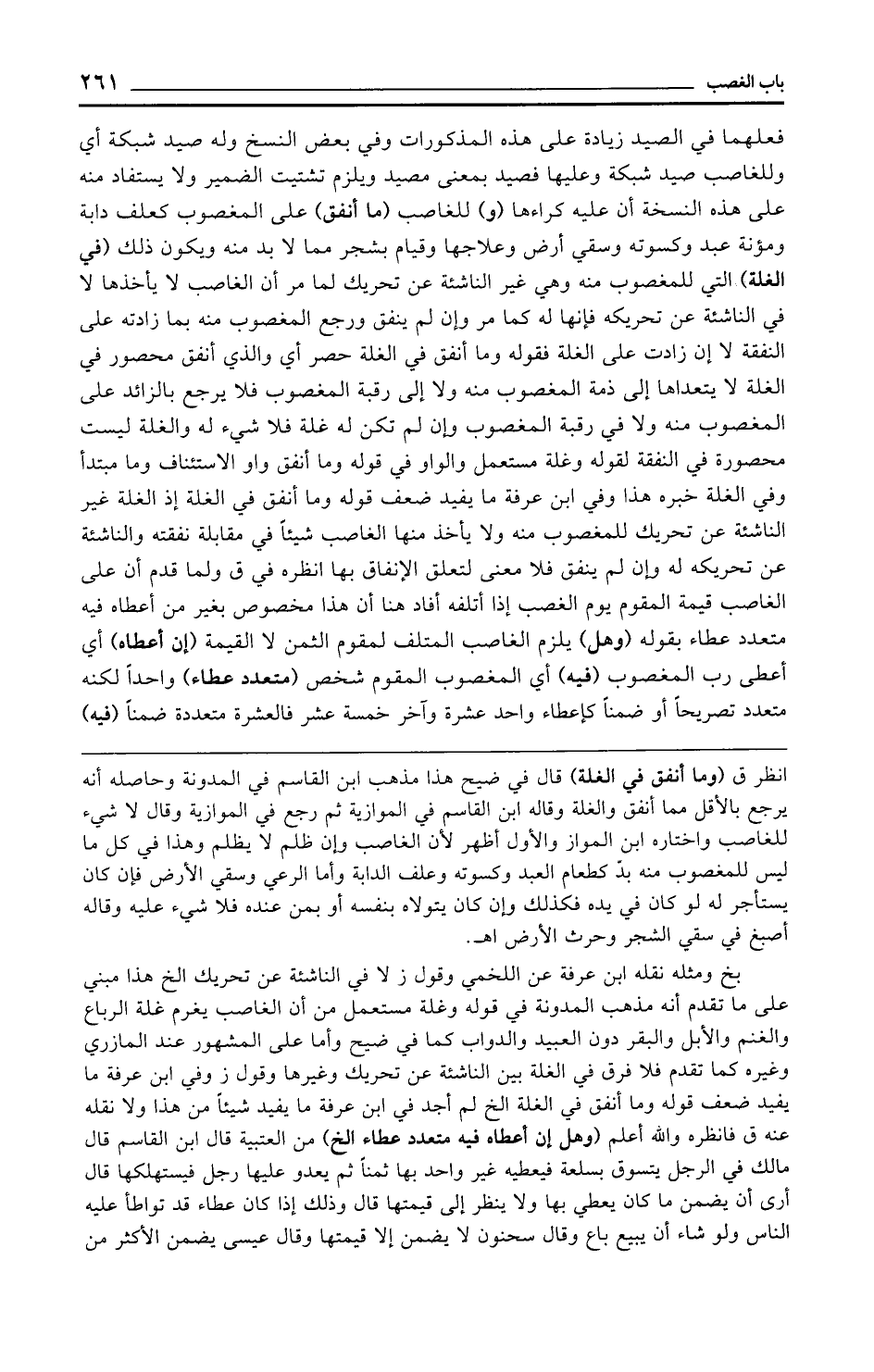 فعلهما في الصيد زيادة على هذه المذكورات وفي بعض النسخ وله صيد شبكة أي وللغاصب صيد شبكة وعليها فصيد بمعنى مصيد ويلزم تشتيت الضمير ولا يستفاد منه على هذه النسخة أن عليه كراءها (و) للغاصب (ما أنفق) على المغصوب كعلف دابة ومؤنة عبد وكسوته وسقي أرض وعلاجها وقيام بشجر مما لا بد منه ويكون ذلك (في الغلة) التي للمغصوب منه وهي غير الناشئة عن تحريك لما مر أن الغاصب لا يأخذها لا في الناشئة عن تحريكه فإنها له كما مر وإن لم ينفق ورجع المغصوب منه بما زادته على النفقة لا إن زادت على الغلة فقوله وما أنفق في الغلة حصر أي والذي أنفق محصور في الغلة لا يتعداها إلى ذمة المغصوب منه ولا إلى رقبة المغصوب فلا يرجع بالزائد على المغصوب منه ولا في رقبة المغصوب وإن لم تكن له غلة فلا شيء له والغلة ليست محصورة في النفقة لقوله وغلة مستعمل والواو في قوله وما أنفق واو الاستئناف وما مبتدأ وفي الغلة خبره هذا وفي ابن عرفة ما يفيد ضعف قوله وما أنفق في الغلة إذ الغلة غير الناشئة عن تحريك للمغصوب منه ولا يأخذ منها الغاصب شيئًا في مقابلة نفقته والناشئة عن تحريكه له وإن لم ينفق فلا معنى لتعلق الإنفاق بها انظره في ق ولما قدم أن على الغاصب قيمة المقوم يوم الغصب إذا أتلفه أفاد هنا أن هذا مخصوص بغير من أعطاه فيه متعدد عطاء بقوله (وهل) يلزم الغاصب المتلف لمقوم الثمن لا القيمة (إن أعطاه) أي أعطى رب المغصوب (فيه) أي المغصوب المقوم شخص (متعدد عطاء) واحدًا لكنه متعدد تصريحًا أو ضمنًا كإعطاء واحد عشرة وآخر خمسة عشر فالعشرة متعددة ضمنًا (فيه)