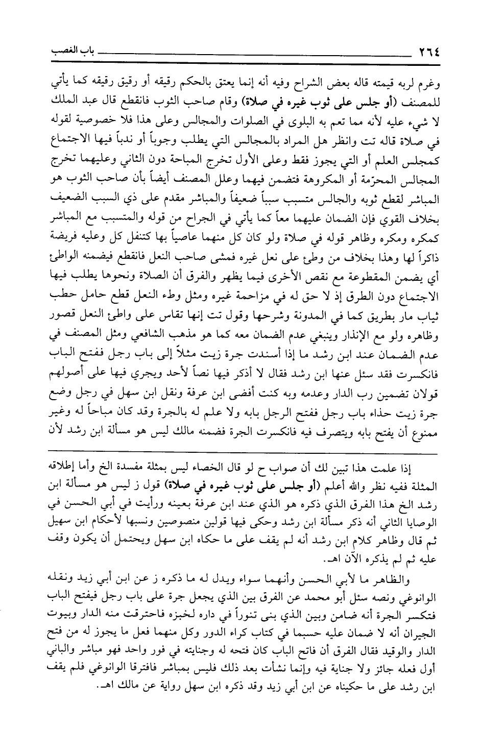 وغرم لربه قيمته قاله بعض الشراح وفيه أنه إنما يعتق بالحكم رقيقه أو رقيق رقيقه كما يأتي للمصنف (أو جلس على ثوب غيره في صلاة) وقام صاحب الثوب فانقطع قال عبد الملك لا شيء عليه لأنه مما تعم به البلوى في الصلوات والمجالس وعلى هذا فلا خصوصية لقوله في صلاة قاله تت وانظر هل المراد بالمجالس التي يطلب وجوبًا أو ندبًا فيها الاجتماع كمجلس العلم أو التي يجوز فقط وعلى الأول تخرج المباحة دون الثاني وعليهما تخرج المجالس المحرمة أو المكروهة فتضمن فيهما وعلل المصنف أيضًا بأن صاحب الثوب هو المباشر لقطع ثوبه والجالس متسبب سببًا ضعيفًا والمباشر مقدم على ذي السبب الضعيف بخلاف القوي فإن الضمان عليهما معًا كما يأتي في الجراح من قوله والمتسبب مع المباشر كمكره ومكره وظاهر قوله في صلاة ولو كان كل منهما عاصيًا بها كتنفل كل وعليه فريضة ذاكرًا لها وهذا بخلاف من وطئ على نعل غيره فمشى صاحب النعل فانقطع فيضمنه الواطىء أي يضمن المقطوعة مع نقص الأخرى فيما يظهر والفرق أن الصلاة ونحوها يطلب فيها الاجتماع دون الطرق إذ لا حق له في مزاحمة غيره ومثل وطء النعل قطع حامل حطب ثياب مار بطريق كما في المدونة وشرحها وقول تت إنها تقاس على واطئ النعل قصور وظاهره ولو مع الإنذار وينبغي عدم الضمان معه كما هو مذهب الشافعي ومثل المصنف في عدم الضمان عند ابن رشد ما إذا أسندت جرة زيت مثلًا إلى باب رجل ففتح الباب فانكسرت فقد سئل عنها ابن رشد فقال لا أذكر فيها نصًّا لأحد ويجري فيها على أصولهم قولان تضمين رب الدار وعدمه وبه كنت أفضى ابن عرفة ونقل ابن سهل في رجل وضع جرة زيت حذاء باب رجل ففتح الرجل بابه ولا علم له بالجرة وقد كان مباحًا له وغير ممنوع أن يفتح بابه ويتصرف فيه فانكسرت الجرة فضمنه مالك ليس هو مسألة ابن رشد لأن