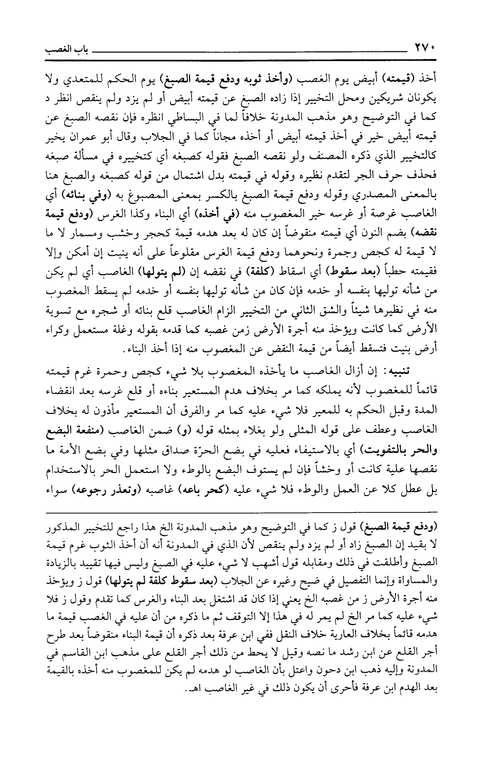 (ودفع قيمة الصبغ) قول ز كما في التوضيح وهو مذهب المدونة الخ هذا راجع للتخيير المذكور لا بقيد إن الصبغ زاد أو لما يزد ولم ينقص لأن الذي في المدونة أنه أن أخذ الثوب غرم قيمة الصبغ وأطلقت في ذلك ومقابله قول أشهب لا شيء عليه في الصبغ وليس فيها تقييد بالزيادة والمساواة وإنما التفصيل في ضيح وغيره عن الجلاب (بعد سقوط كلفة لم يتولها) قول ز ويؤخذ منه أجرة الأرض ز من غصبه الخ يعني إذا كان قد اشتغل بعد البناء والغرس كما تقدم وقول ز فلا شيء عليه كما مر الخ لم يمر له في هذا إلا التوقف ثم ما ذكره من أن عليه في الغصب قيمة ما هدمه قائمًا بخلاف العارية خلاف النقل ففي ابن عرفة بعد ذكره أن قيمة البناء منقوضًا بعد طرح أجر القلع عن ابن رشد ما نصه وقيل لا يحط من ذلك أجر القلع على مذهب ابن القاسم في المدونة وإليه ذهب ابن دحون واعتل بأن الغاصب لو هدمه لم يكن للمغصوب منه أخذه بالقيمة بعد الهدم ابن عرفة فأحرى أن يكون ذلك في غير الغاصب اهـ.