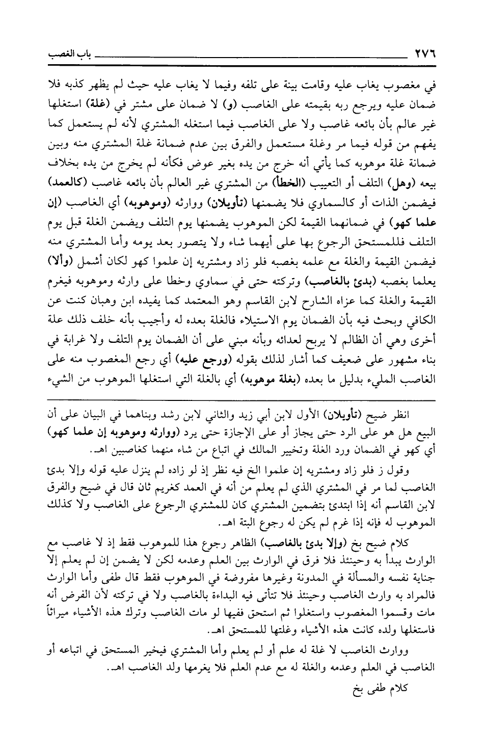 في مغصوب يغاب عليه وقامت بينة على تلفه وفيما لا يغاب عليه حيث لم يظهر كذبه فلا ضمان عليه ويرجع ربه بقيمته على الغاصب (و) لا ضمان على مشتر في (غلة) استغلها غير عالم بأن بائعه غاصب ولا على الغاصب فيما استغله المشتري لأنه لم يستعمل كما يفهم من قوله فيما مر وغلة مستعمل والفرق بين عدم ضمانة غلة المشتري منه وبين ضمانة غلة موهوبه كما يأتي أنه خرج من يده بغير عوض فكأنه لم يخرج من يده بخلاف بيعه (وهل) التلف أو التعييب (الخطأ) من المشتري غير العالم بأن بائعه غاصب (كالعمد) فيضمن الذات أو كالسماوي فلا يضمنها (تأويلان) ووارثه (وموهوبه) أي الغاصب (إن علما كهو) في ضمانهما القيمة لكن الموهوب يضمنها يوم التلف ويضمن الغلة قبل يوم التلف فللمستحق الرجوع بها على أيهما شاء ولا يتصور بعد يومه وأما المشتري منه فيضمن القيمة والغلة مع علمه بغصبه فلو زاد ومشتريه إن علموا كهو لكان أشمل (وألا) يعلما بغصبه (بدئ بالغاصب) وتركته حتى في سماوي وخطا على وارثه وموهوبه فيغرم القيمة والغلة كما عزاه الشارح لابن القاسم وهو المعتمد كما يفيده ابن وهبان كنت عن الكافي وبحث فيه بأن الضمان يوم الاستيلاء فالغلة بعده له وأجيب بأنه خلف ذلك علة أخرى وهي أن الظالم لا يربح لعدائه وبأنه مبني على أن الضمان يوم التلف ولا غرابة في بناء مشهور على ضعيف كما أشار لذلك بقوله (ورجع عليه) أي رجع المغصوب منه على الغاصب المليء بدليل ما بعده (بغلة موهوبه) أي بالغلة التي استغلها الموهوب من الشيء