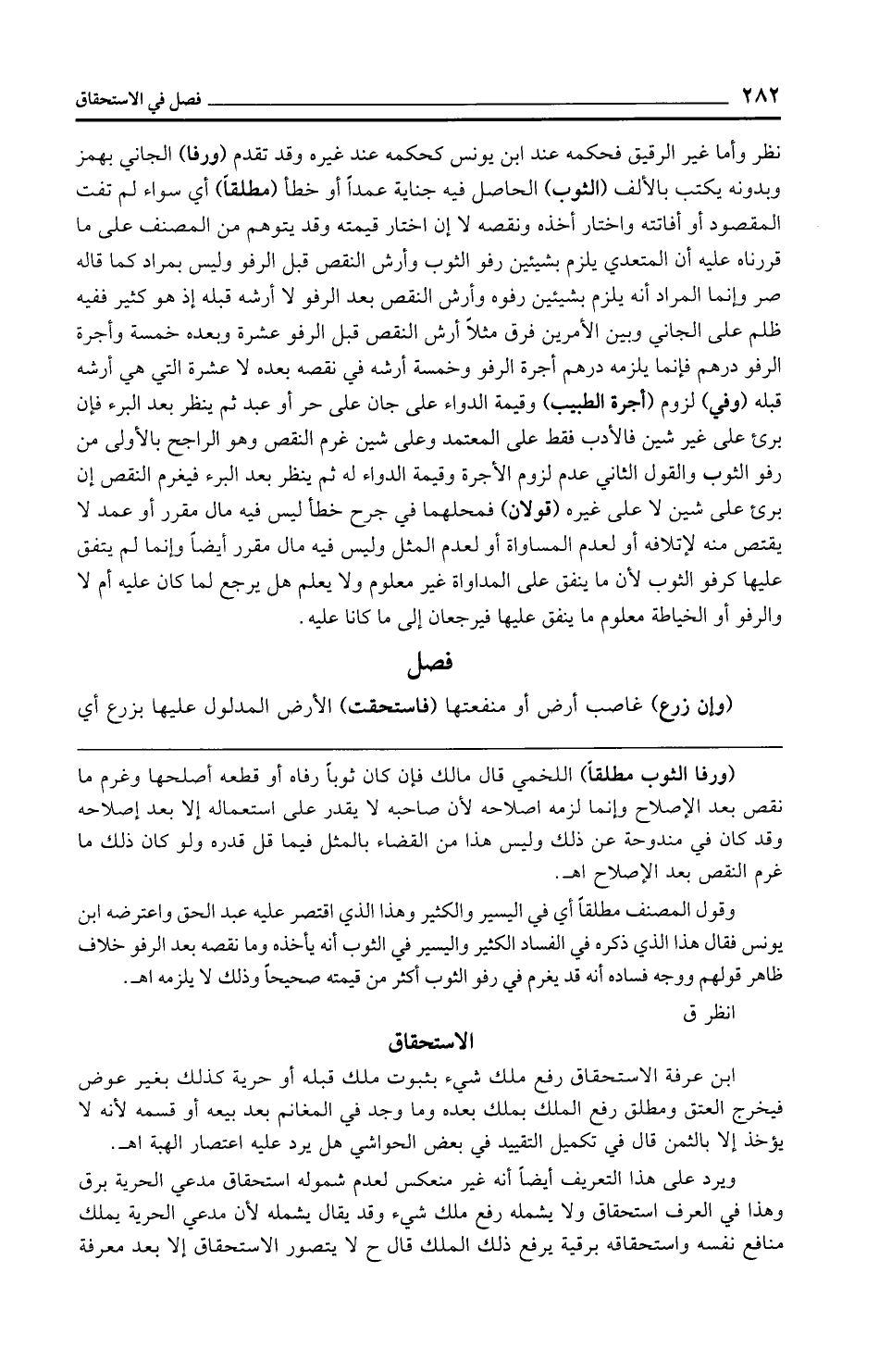 ابن عرفة الاستحقاق رفع ملك شيء بثبوت ملك قبله أو حرية كذلك بغير عوض فيخرج العتق ومطلق رفع الملك بملك بعده وما وجد في المغانم بعد بيعه أو قسمه لأنه لا يؤخذ إلا بالثمن قال في تكميل التقييد في بعض الحواشي هل يرد عليه اعتصار الهبة اهـ.