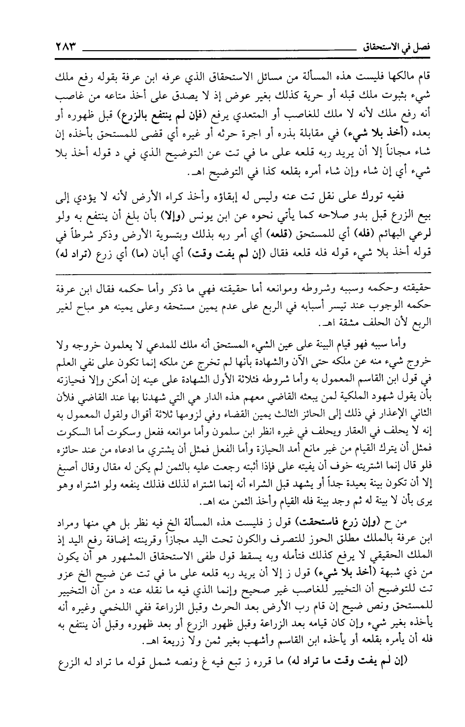 قام مالكها فليست هذه المسألة من مسائل الاستحقاق الذي عرفه ابن عرفة بقوله رفع ملك شيء بثبوت ملك قبله أو حرية كذلك بغير عوض إذ لا يصدق على أخذ متاعه من غاصب أنه رفع ملك لأنه لا ملك للغاصب أو المتعدي يرفع (فإن لم ينتفع بالزرع) قبل ظهوره أو بعده (أخذ بلا شيء) في مقابلة بذره أو أجرة حرثه أو غيره أي قضى للمستحق بأخذه إن شاء مجانًا إلا أن يريد ربه قلعه على ما في تت عن التوضيح الذي في د قوله أخذ بلا شيء أي إن شاء وإن شاء أمره بقلعه كذا في التوضيح اهـ.