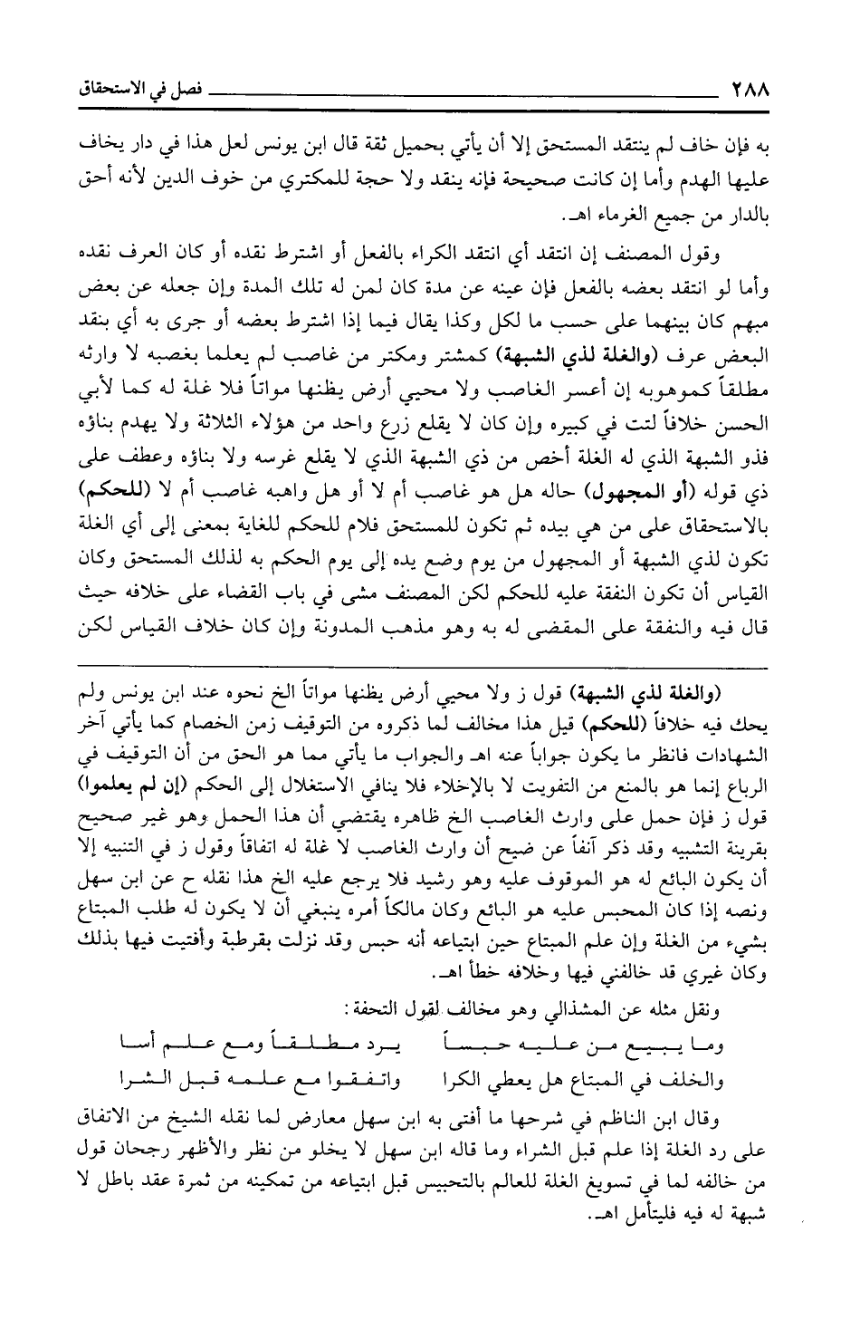 وقال ابن الناظم في شرحها ما أفتى به ابن سهل معارض لما نقله الشيخ من الاتفاق على رد الغلة إذا علم قبل الشراء وما قاله ابن سهل لا يخلو من نظر والأظهر رجحان قول من خالفه لما في تسويغ الغلة للعالم بالتحبيس قبل ابتياعه من تمكينه من ثمرة عقد باطل لا شبهة له فيه فليتأمل اهـ.