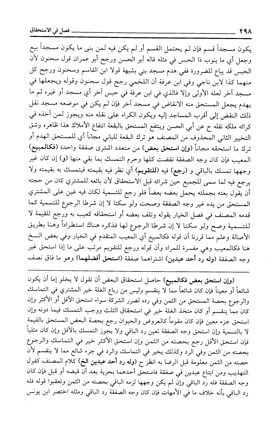 يكون مسجدًا قسم فإن لم يحتمل القسم أو لم يكن فيه لمن بنى ما يكون مسجدًا بيع وجعل أي ما ينوب ذا الحبس في مثله قاله أبو الحسن ورجح أبو عمران قول سحنون لأن الحبس قد يباع للضرورة ففي هدم مسجد بني شبهة قولا ابن القاسم وسحنون ورجح كل منهما كذا لابن ناجي وفي ابن عرفة أن اللخمي رجح قول سحنون وقوله ويجعلها في مسجد آخر لعله الأولى وإلا فالذي في ابن عرفة في حبس آخر أي مسجد أو غيره ثم ما يهدم يجعل المستحق منه الأنقاض في مسجد آخر فإن لم يكن في موضعه مسجد نقل ذلك النقض إلى أقرب المساجد إليه ويكون الكراء على نقله منه ويجوز لمن أخذه في كرائه ملكه نقله ح عن أبي الحسن وينتفع المستحق بالبقعة انتفاع الأملاك هذا ظاهره وشق التخيير الثاني المحذوف من المصنف هو ترك البقعة للباني مجانًا أي للمستحق الهدم أو ترك ما استحقه مجانًا (وإن استحق بعض) من متعدد اشترى صفقة واحدة (فكالمبيع) المعيب فإن كان وجه الصفقة نقضت كلها وحرم التمسك بما بقي منها (و) إن كان غير وجهها تمسك بالباقي و (رجع) فيه (للتقويم) أي نظر فيه بقيمته فيتمسك به بقيمته ولا يرجع فيه لما سمى للجميع حين شرائه قبل الاستحقاق لأن بائعه للمشتري كان من حجته أن يقول بعته بجملته يحمل بعضه بعضًا فلو رجع للتسمية لكان فيه غبن علي المشتري المستحق من يده غير وجه الصفقة وصحت ولو سكتا لا إن شرطا الرجوع للتسمية كما قدمه المصنف في فصل الخيار بقوله وتلف بعضه أو استحقاقه كعيب به ورجع للقيمة لا للتسمية وصح ولو سكتا لا إن شرطا الرجوع لها فذكره هناك استطرادا وهنا بطريق الأصالة وعلم مما قررنا أن قوله فكالمبيع أي المعيب المتقدم في الخيار وفي بعض النسخ هنا فكالمعيب وهي مفسرة للمراد وأن قوله ورجع للتقويم مرتب على ما إذا استحق غير وجه الصفقة (وله رد أحد عبدين) اشتراهما صفقة (استحق أفضلهما) وهو ما فاق نصف