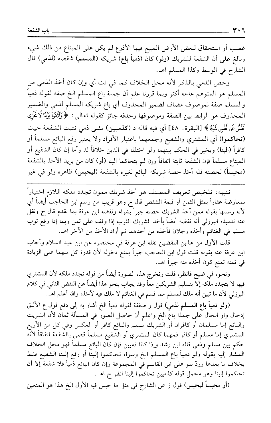 تنبيه: تلخيص تعريف المصنف هو أخذ شريك ممون تجدد ملكه اللازم اختيارًا بمعاوضة عقارًا بمثل الثمن أو قيمة الشقص قال ح وهو قريب من رسم ابن الحاجب أيضًا أي لأنه رسمها بقوله ممن أخذ الشريك حصته جبرًا بشراء ونقضه ابن عرفة بما تقدم قال ح ونقل عنه تلميذه البرزلي أنه نقضه أيضًا بأخذ الشريك الثوب إذا وقف على ثمن وبما إذا وقع ثوب مسلم في الغنائم وأخذه رجلان فأخذه من أحدهما ثم أراد الأخذ من الآخر اهـ.