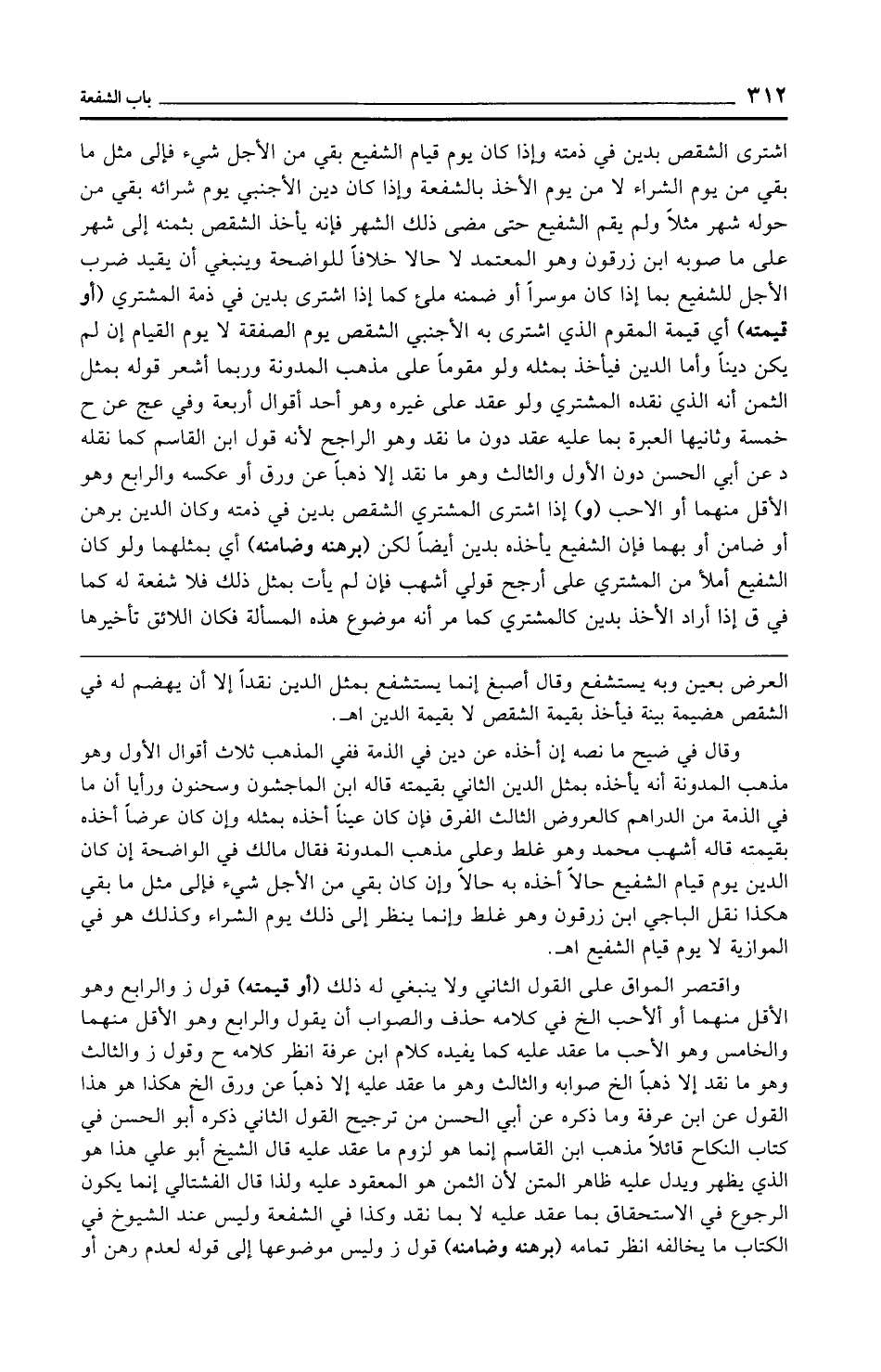 وقال في ضيح ما نصه إن أخذه عن دين في الذمة ففي المذهب ثلاث أقوال الأول وهو مذهب المدونة أنه يأخذه بمثل الدين الثاني بقيمته قاله ابن الماجشون وسحنون ورأيا أن ما في الذمة من الدراهم كالعروض الثالث الفرق فإن كان عينًا أخذه بمثله وإن كان عرضًا أخذه بقيمته قاله أشهب محمد وهو غلط وعلى مذهب المدونة فقال مالك في الواضحة إن كان الدين يوم قيام الشفيع حالًا أخذه به حالًا وإن كان بقي من الأجل شيء فإلى مثل ما بقي هكذا نقل الباجي ابن زرقون وهو غلط وإنما ينظر إلى ذلك يوم الشراء وكذلك هو في الموازية لا يوم قيام الشفيع اهـ.