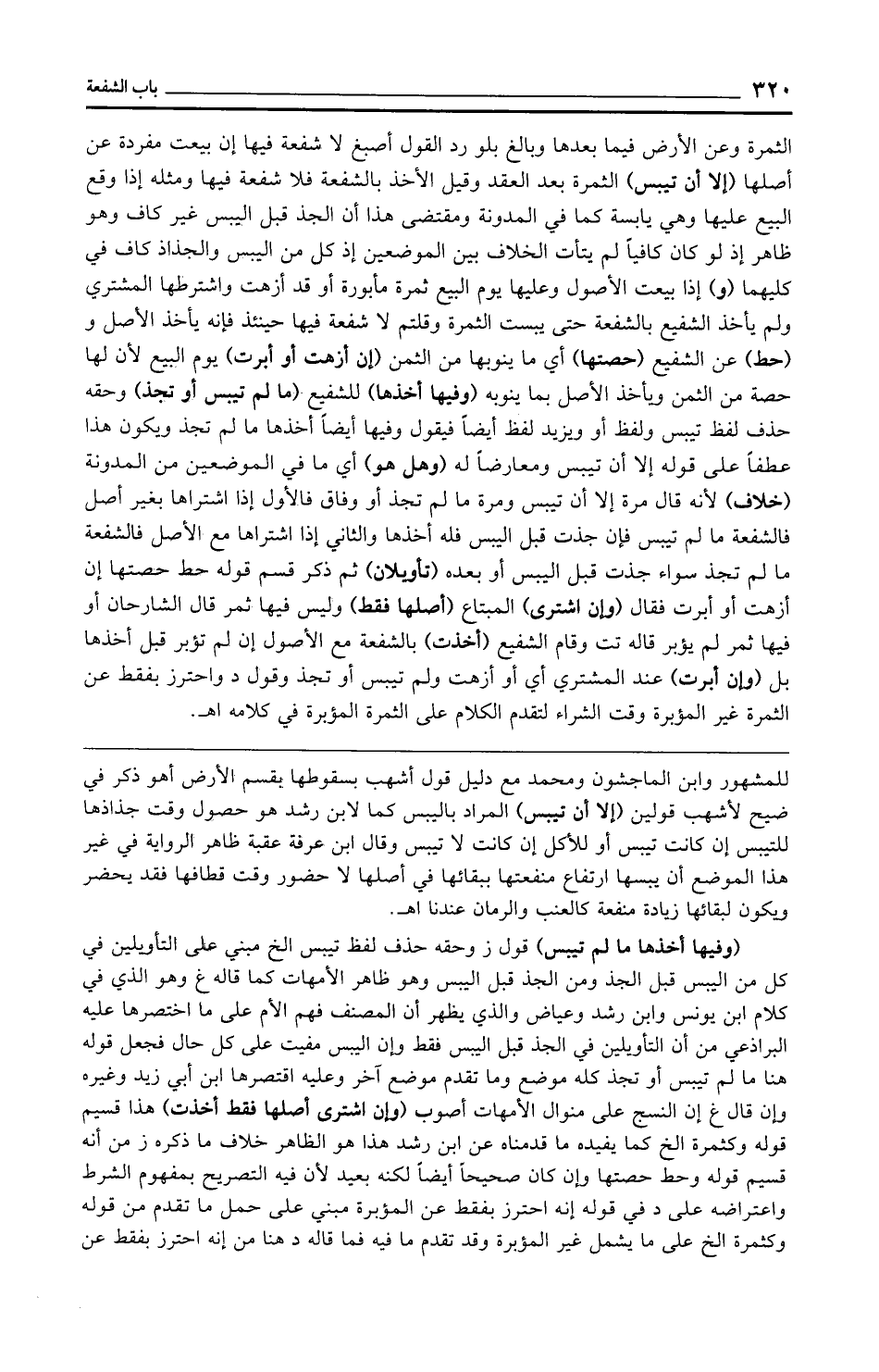 الثمرة وعن الأرض فيما بعدها وبالغ بلو رد القول أصبغ لا شفعة فيها إن بيعت مفردة عن أصلها (إلا أن تيبس) الثمرة بعد العقد وقيل الأخذ بالشفعة فلا شفعة فيها ومثله إذا وقع البيع عليها وهي يابسة كما في المدونة ومقتضى هذا أن الجذ قبل اليبس غير كاف وهو ظاهر إذ لو كان كافيًا لم يتأت الخلاف بين الموضعين إذ كل من اليبس والجذاذ كاف في كليهما (و) إذا بيعت الأصول وعليها يوم البيع ثمرة مأبورة أو قد أزهت واشترطها المشتري ولم يأخذ الشفيع بالشفعة حتى يبست الثمرة وقلتم لا شفعة فيها حينئذ فإنه يأخذ الأصل و (حط) عن الشفيع (حصتها) أي ما ينوبها من الثمن (إن أزهت أو أبرت) يوم البيع لأن لها حصة من الثمن ويأخذ الأصل بما ينوبه (وفيها أخذها) للشفيع (ما لم تيبس أو تجذ) وحقه حذف لفظ تيبس ولفظ أو ويزيد لفظ أيضًا فيقول وفيها أيضًا أخذها ما لم تجد ويكون هذا عطفًا على قوله إلا أن تيبس ومعارضًا له (وهل هو) أي ما في الموضعين من المدونة (خلاف) لأنه قال مرة إلا أن تيبس ومرة ما لم تجد أو وفاق فالأول إذا اشتراها بغير أصل فالشفعة ما لم تيبس فإن جذت قبل اليبس فله أخذها والثاني إذا اشتراها مع الأصل فالشفعة ما لم تجد سواء جذت قبل اليبس أو بعده (تأويلان) ثم ذكر قسم قوله حط حصتها إن أزهت أو أبرت فقال (وإن اشترى) المبتاع (أصلها فقط) وليس فيها ثمر قال الشارحان أو فيها ثمر لم يؤبر قاله تت وقام الشفيع (أخذت) بالشفعة مع الأصول إن لم تؤبر قبل أخذها بل (وإن أبرت) عند المشتري أي أو أزهت ولم تيبس أو تجد وقول د واحترز بفقط عن الثمرة غير المؤبرة وقت الشراء لتقدم الكلام على الثمرة المؤبرة في كلامه اهـ.