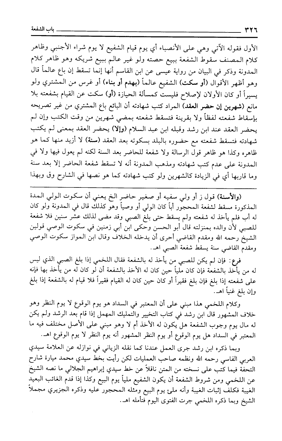 وبما ذكره ابن رشد جرى العمل عندنا كما نقله الزياني في نوازله عن العلامة سيدي العربي الفاسي رحمه الله ونظمه صاحب العمليات لكن رأيت بخط سيدي محمد ميارة شارح التحفة فيما كتب على نسخته من المتن ناقلًا عن خط سيدي إبراهيم الجلالي ما نصه الشيخ عن اللخمي ومن شروط الشفعة أن يكون الشفيع مليًّا يوم البيع وكذا إذا قدم الغائب البعيد الغيبة فكلف إثبات الغيبة وأنه ملىء يوم البيع ومثله المحجور عليه وذكره الجزيري مجملًا الشيخ وبما ذكره اللخمي جرت الفتوى اليوم فتأمله اهـ.