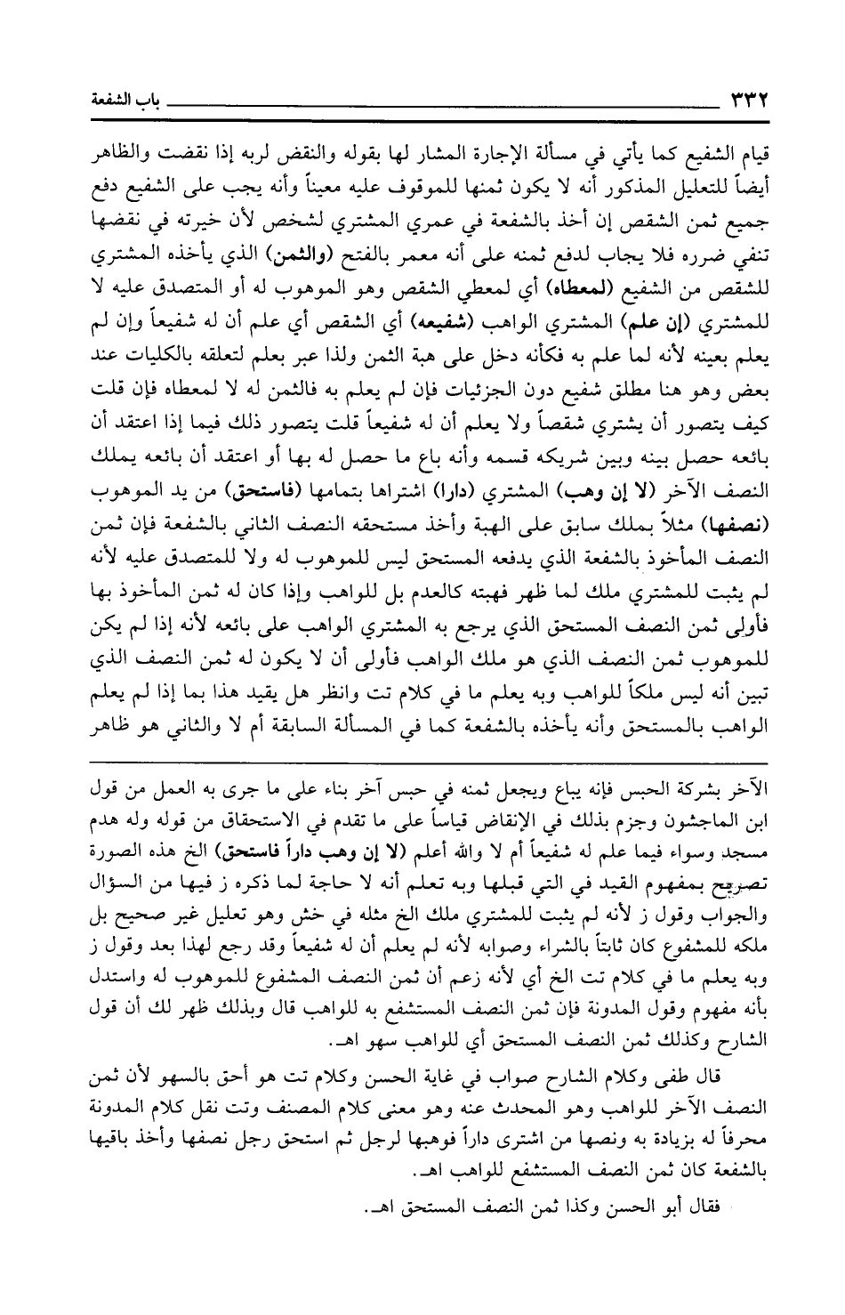 قال طفى وكلام الشارح صواب في غاية الحسن وكلام تت هو أحق بالسهو لأن ثمن النصف الآخر للواهب وهو المحدث عنه وهو معنى كلام المصنف وتت نقل كلام المدونة محرفًا له بزيادة به ونصها من اشترى دارًا فوهبها لرجل ثم استحق رجل نصفها وأخذ باقيها بالشفعة كان ثمن النصف المستشفع للواهب اهـ.
