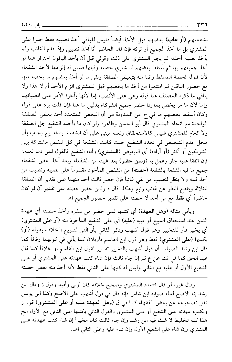 بشفعتهم (أو غاب) بعضهم قبل الأخذ أيضًا فليس للباقي أخذ نصيبه فقط جبرًا على المشتري بل ما أخذ الجميع أو تركه فإن قال الحاضر أنا آخذ نصيبي وإذا قدم الغائب ولم يأخذ نصيبه أخذته لم يجبر المشتري على ذلك وقولي قبل أن يأخذ الباقون احتراز عما لو أخذ جميعهم بها ثم أسقط بعضهم للمشتري حصته وقبلها فليس له إلزامها لأحد الشفعاء لأن قبوله لحصة المسقط رضا منه بتبعيض الصفقة وبقي ما لو أخذ بعضهم ما يخصه منها مع حضور الباقين ثم امتنعوا من أخذ ما يخصهم فهل للمشتري إلزام الأخذ أم لا هذا ولا ينافي ما ذكره المصنف هنا قوله وهي على الأنصباء إما لأنها بآخرة الأمر على أنصبائهم وإما لأن ما مر يخص بما إذا حضر جميع الشركاء بدليل ما هنا فإن قلت يرد على قوله وكان أسقط بعضهم ما في ح عن المدونة من أن البعض المتعدد أخذ بعض الصفقة الواحدة مع اتحاد المشتري قال أبو الحسن وظاهره ولو كان ما يأخذه الشفيع جل الصفقة ولا كلام للمشتري فليس كالاستحقاق ولعله مبني على أن الشفعة ابتداء بيع يجاب بأن محل عدم التبعيض في تعدد الشفيع حيث كانت الشفعة في كل شقص مشتركة بين الشريكين أو أكثر (أو أراده) أي التبعيض (المشتري) وأباه الشفيع فالقول لمن دعا لعدمه فإن اتفقا عليه جاز وعمل به (ولمن حضر) بعد غيبته من الشفعاء وبعد أخذ بعض الشفعاء جميع ما فيه الشفعة بالشفعة (حصته) من الشقص المأخوذ مقسومًا على نصيبه ونصيب من أخذ قبله ولا ينظر لنصيب من بقي غائبًا فإن حضر ثالث أخذ منهما على تقدير أن الصفقة للثلاثة وبقطع النظر عن غائب رابع وهكذا قال د ولمن حضر حصته على تقدير أن لو كان حاضرًا أي فقط مع من أخذ لا حصته على تقدير حضور الجميع اهـ.