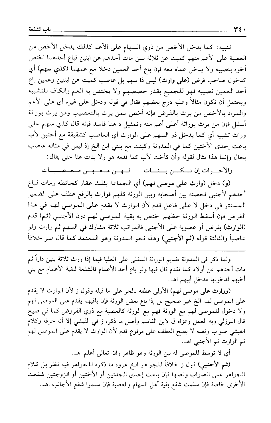 تنبيه: كما يدخل الأخص من ذوي السهام على الأعم كذلك يدخل الأخص من العصبة على الأعم منهم كميت عن ثلاثة بنين مات أحدهم عن ابنين فباع أحدهما اختص أخوه بنصيبه ولا يدخل عماه معه فإن باع أحد العمين دخلا مع عمهما (كذي سهم) أي كدخول صاحب فرض (على وارث) ليس ذا سهم بل عاصب كميت عن ابنتين وعمين باع أحد العمين نصيبه فهو للجميع بقدر حصصهم ولا يختص به العم والكاف للتشبيه ويحتمل أن تكون مثالًا وعليه درج بعضهم فقال في قوله ودخل على غيره أي على الأعم والمراد بالأخص من يرث بالفرض فإنه أخص ممن يرث بالتعصيب ومن يرث بوراثة أسفل فإن من يرث بوراثة أعلى أعم منه وتمثيل د هنا فاسد فإنه قال كذي سهم على وراث تشبيه أي كما يدخل ذو السهم على الوارث أي العاصب كشقيقة مع أختين لأب باعت إحدى الأختين كما في المدونة وكبنت مع بنتي ابن الخ إذ ليس في مثاله عاصب بحال وإنما هذا مثال لقوله وأن كأخت لأب كما قدمه هو ولا بنات هنا حتى يقال: