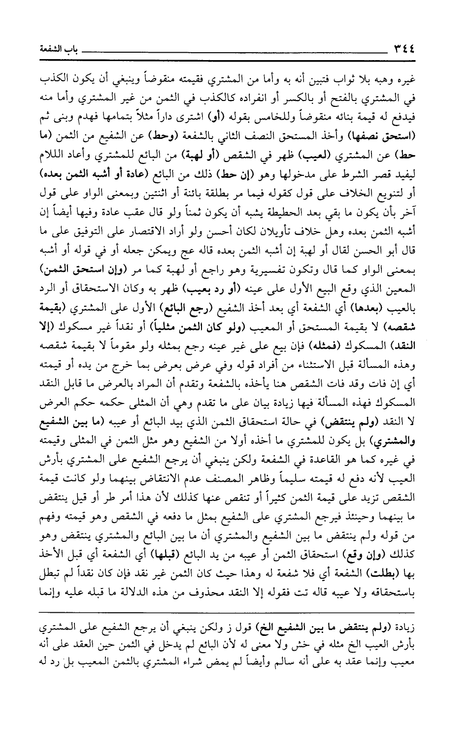 زيادة (ولم ينتقض ما بين الشفيع الخ) قول ز ولكن ينبغي أن يرجع الشفيع على المشتري بأرش العيب الخ مثله في خش ولا معنى له لأن البائع لم يدخل في الثمن حين العقد على أنه معيب وإنما عقد به على أنه سالم وأيضًا لم يمض شراء المشتري بالثمن المعيب بل رد له