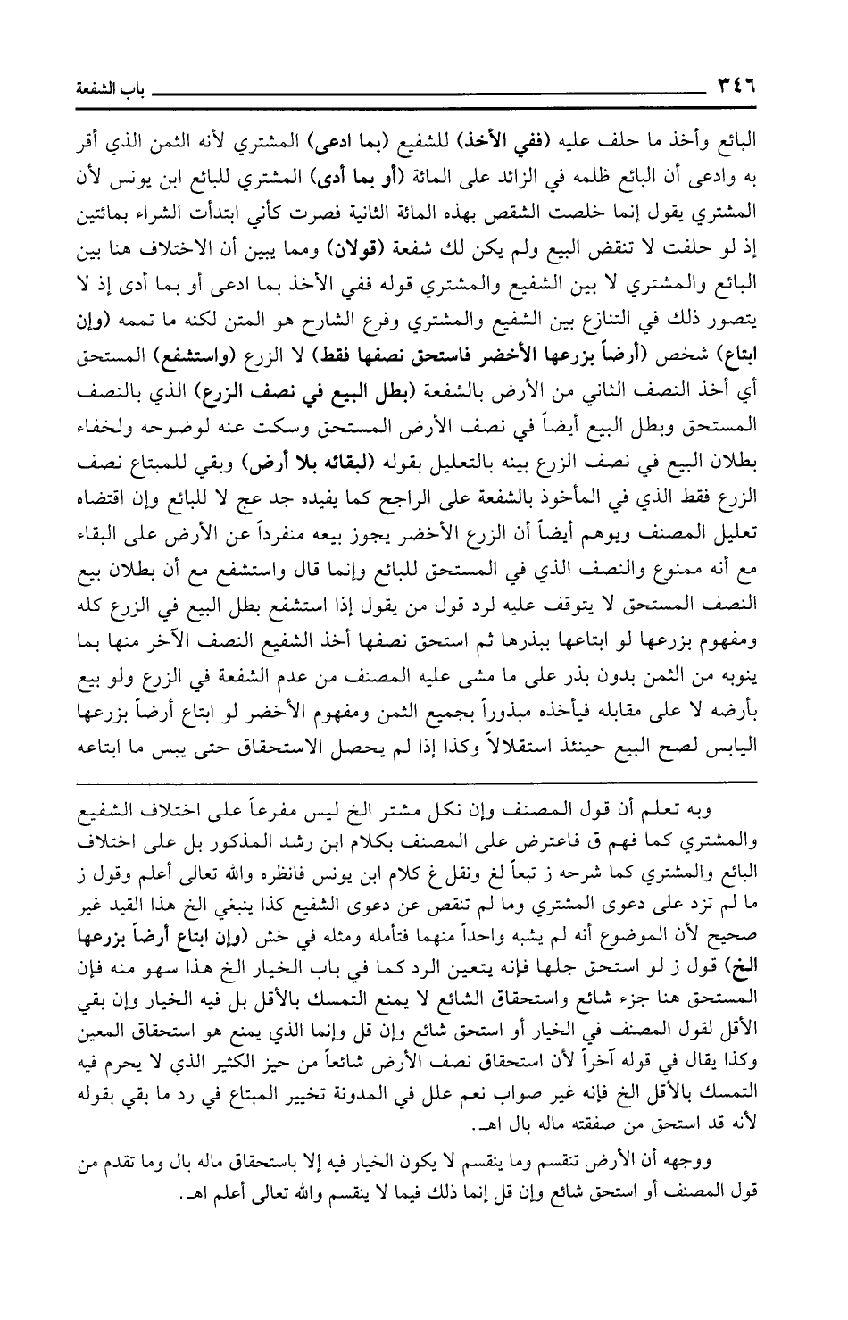 وبه تعلم أن قول المصنف وإن نكل مشتر الخ ليس مفرعًا على اختلاف الشفيع والمشتري كما فهم ق فاعترض على المصنف بكلام ابن رشد المذكور بل على اختلاف البائع والمشتري كما شرحه ز تبعًا لغ ونقل غ كلام ابن يونس فانظره والله تعالى أعلم وقول ز ما لم تزد على دعوى المشتري وما لم تنقص عن دعوى الشفيع كذا ينبغي الخ هذا القيد غير صحيح لأن الموضوع أنه لم يشبه واحدًا منهما فتأمله ومثله في خش (وإن ابتاع أرضًا بزرعها الخ) قول ز لو استحق جلها فإنه يتعين الرد كما في باب الخيار الخ هذا سهو منه فإن المستحق هنا جزء شائع واستحقاق الشائع لا يمنع التمسك بالأقل بل فيه الخيار وإن بقي الأقل لقول المصنف في الخيار أو استحق شائع وإن قل وإنما الذي يمنع هو استحقاق المعين وكذا يقال في قوله آخرًا لأن استحقاق نصف الأرض شائعًا من حيز الكثير الذي لا يحرم فيه التمسك بالأقل الخ فإنه غير صواب نعم علل في المدونة تخيير المبتاع في رد ما بقي بقوله لأنه قد استحق من صفقته ماله بال اهـ.