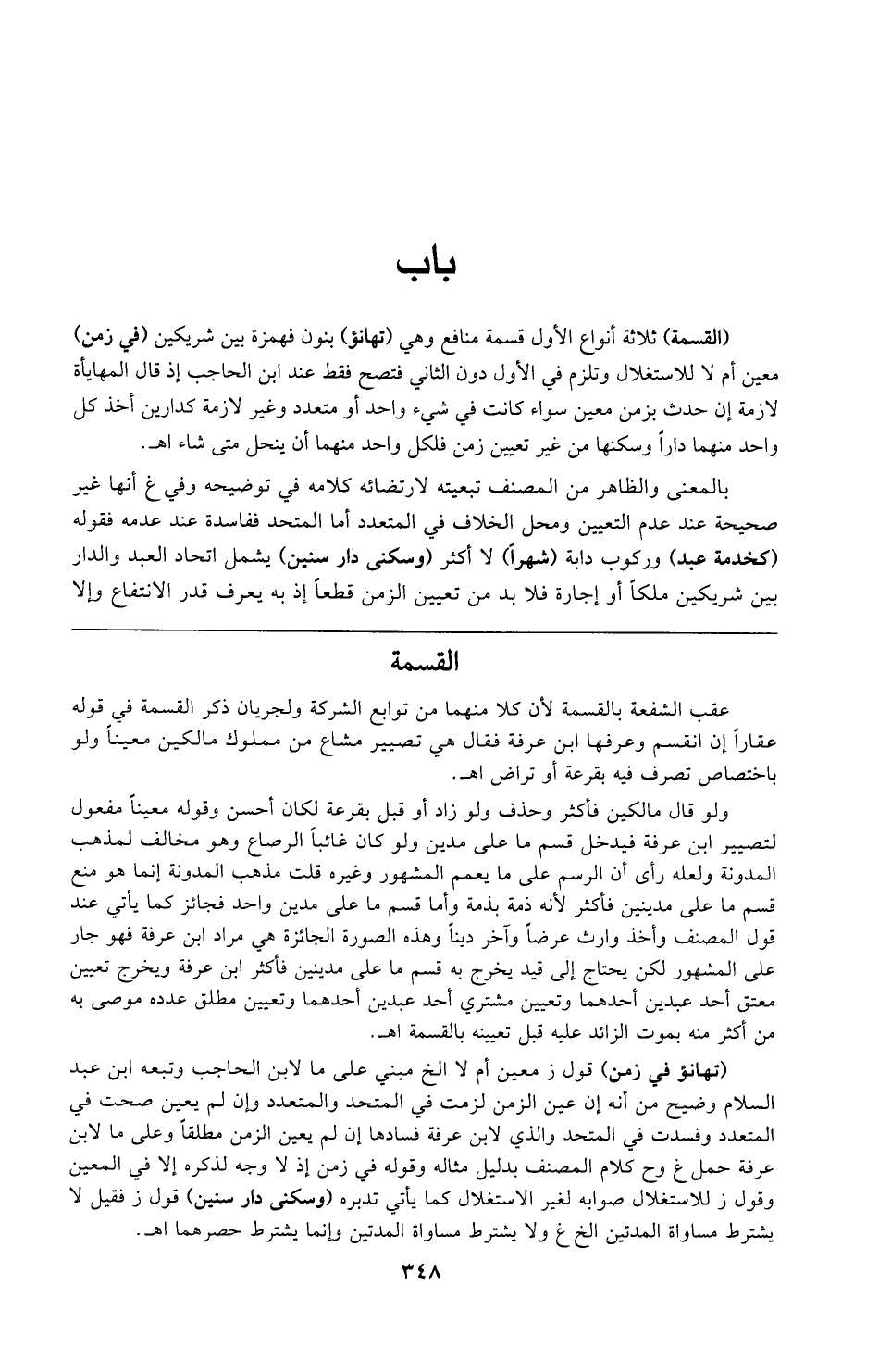 (القسمة) ثلاثة أنواع الأول قسمة منافع وهي (تهانؤ) بنون فهمزة بين شريكين (في زمن) معين أم لا للاستغلال وتلزم في الأول دون الثاني فتصح فقط عند ابن الحاجب إذ قال المهايأة لازمة إن حدث بزمن معين سواء كانت في شيء واحد أو متعدد وغير لازمة كدارين أخذ كل واحد منهما دارًا وسكنها من غير تعيين زمن فلكل واحد منهما أن ينحل متى شاء اهـ.