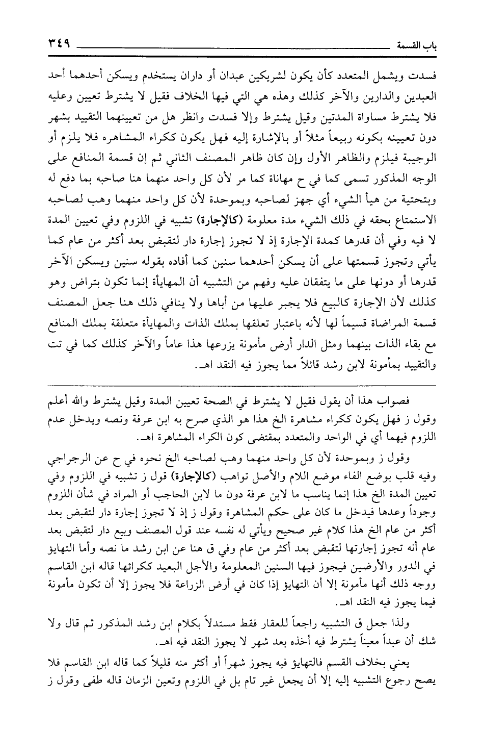 وقول ز وبموحدة لأن كل واحد منهما وهب لصاحبه الخ نحوه في ح عن الرجراجي وفيه قلب بوضع الفاء موضع اللام والأصل تواهب (كالإجارة) قول ز تشبيه في اللزوم وفي تعيين المدة الخ هذا إنما يناسب ما لابن عرفة دون ما لابن الحاجب أو المراد في شأن اللزوم وجودًا وعدها فيدخل ما كان على حكم المشاهرة وقول ز إذ لا تجوز إجارة دار لتقبض بعد أكثر من عام الخ هذا كلام غير صحيح ويأتي له نفسه عند قول المصنف وبيع دار لتقبض بعد عام أنه تجوز إجارتها لتقبض بعد أكثر من عام وفي ق هنا عن ابن رشد ما نصه وأما التهايؤ في الدور والأرضين فيجوز فيها السنين المعلومة والأجل البعيد ككرائها قاله ابن القاسم ووجه ذلك أنها مأمونة لا أن التهايؤ إذا كان في أرض الزراعة فلا يجوز إلا أن تكون مأمونة فيما يجوز فيه النقد اهـ.