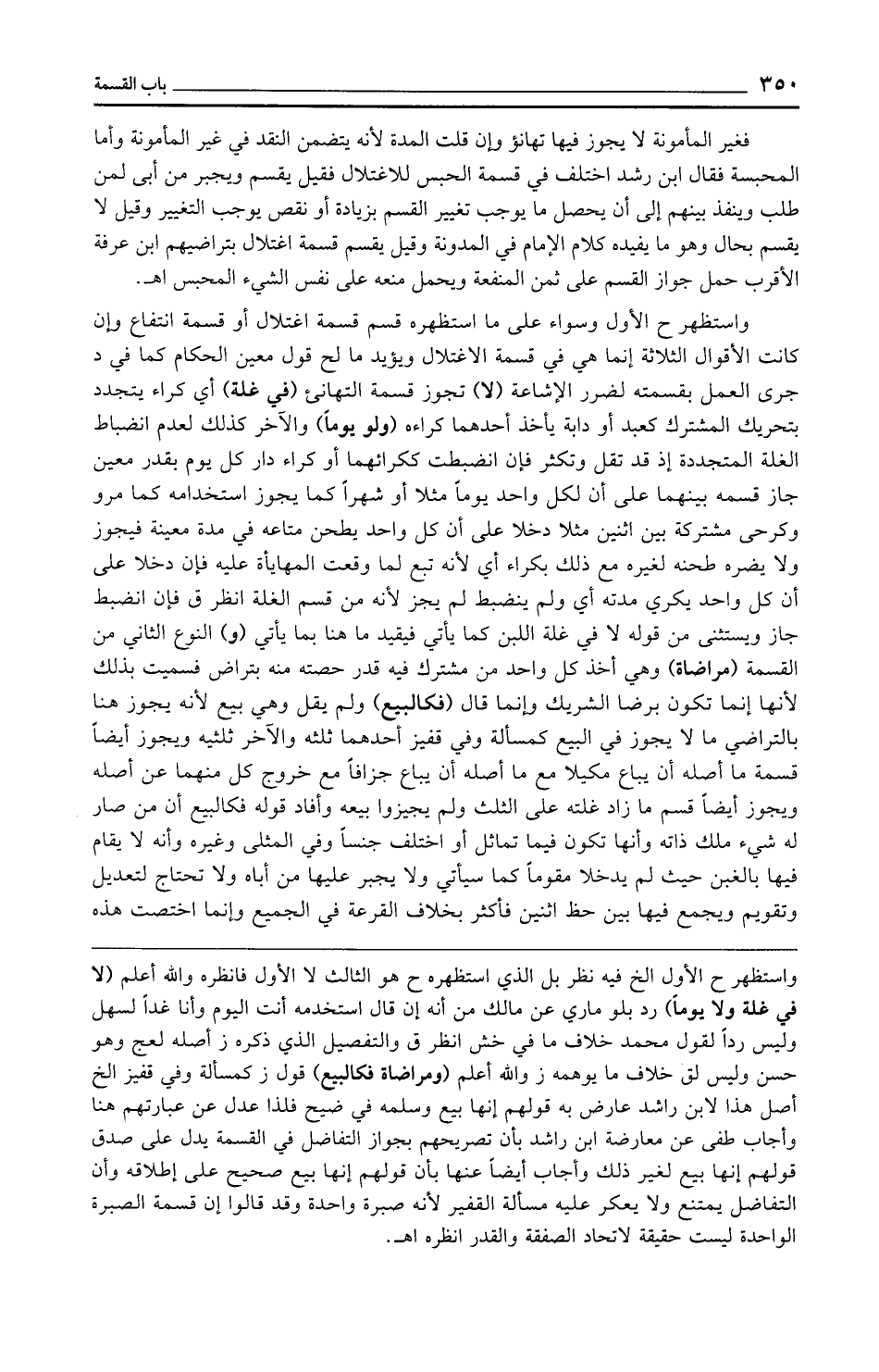 واستظهر ح الأول وسواء على ما استظهره قسم قسمة اغتلال أو قسمة انتفاع وإن كانت الأقوال الثلاثة إنما هي في قسمة الاغتلال ويؤيد ما لح قول معين الحكام كما في د جرى العمل بقسمته لضرر الإشاعة (لا) تجوز قسمة التهانئ (في غلة) أي كراء يتجدد بتحريك المشترك كعبد أو دابة يأخذ أحدهما كراءه (ولو يومًا) والآخر كذلك لعدم انضباط الغلة المتجددة إذ قد تقل وتكثر فإن انضبطت ككرائهما أو كراء دار كل يوم بقدر معين جاز قسمه بينهما على أن لكل واحد يوما مثلا أو شهرًا كما يجوز استخدامه كما مرو وكرحى مشتركة بين اثنين مثلا دخلا على أن كل واحد يطحن متاعه في مدة معينة فيجوز ولا يضره طحنه لغيره مع ذلك بكراء أي لأنه تبع لما وقعت المهايأة عليه فإن دخلا على أن كل واحد يكري مدته أي ولم ينضبط لم يجز لأنه من قسم الغلة انظر ق فإن انضبط جاز ويستثنى من قوله لا في غلة اللبن كما يأتي فيقيد ما هنا بما يأتي (و) النوع الثاني من القسمة (مراضاة) وهي أخذ كل واحد من مشترك فيه قدر حصته منه بتراض فسميت بذلك لأنها إنما تكون برضا الشريك وإنما قال (فكالبيع) ولم يقل وهي بيع لأنه يجوز هنا بالتراضي ما لا يجوز في البيع كمسألة وفي قفيز أحدهما ثلثه والآخر ثلثيه ويجوز أيضًا قسمة ما أصله أن يباع مكيلا مع ما أصله أن يباع جزافًا مع خروج كل منهما عن أصله ويجوز أيضًا قسم ما زاد غلته على الثلث ولم يجيزوا بيعه وأفاد قوله فكالبيع أن من صار له شيء ملك ذاته وأنها تكون فيما تماثل أو اختلف جنسًا وفي المثلى وغيره وأنه لا يقام فيها بالغبن حيث لم يدخلا مقومًا كما سيأتي ولا يجبر عليها من أباه ولا تحتاج لتعديل وتقويم ويجمع فيها بين حظ اثنين فأكثر بخلاف القرعة في الجميع وإنما اختصت هذه