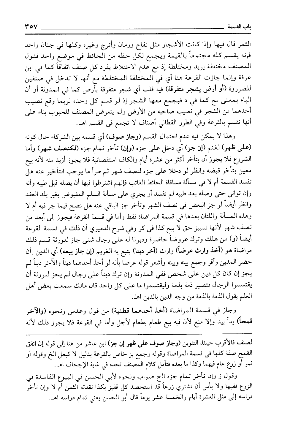 وجاز في قسمة المراضاة (أخذ أحدهما قطنية) من فول وعدس ونحوه (والآخر قمحًا) يدًا بيد وإلا منع لأن فيه بيع طعام بطعام لأجل وأما في القرعة فلا يجوز ذلك لأنه