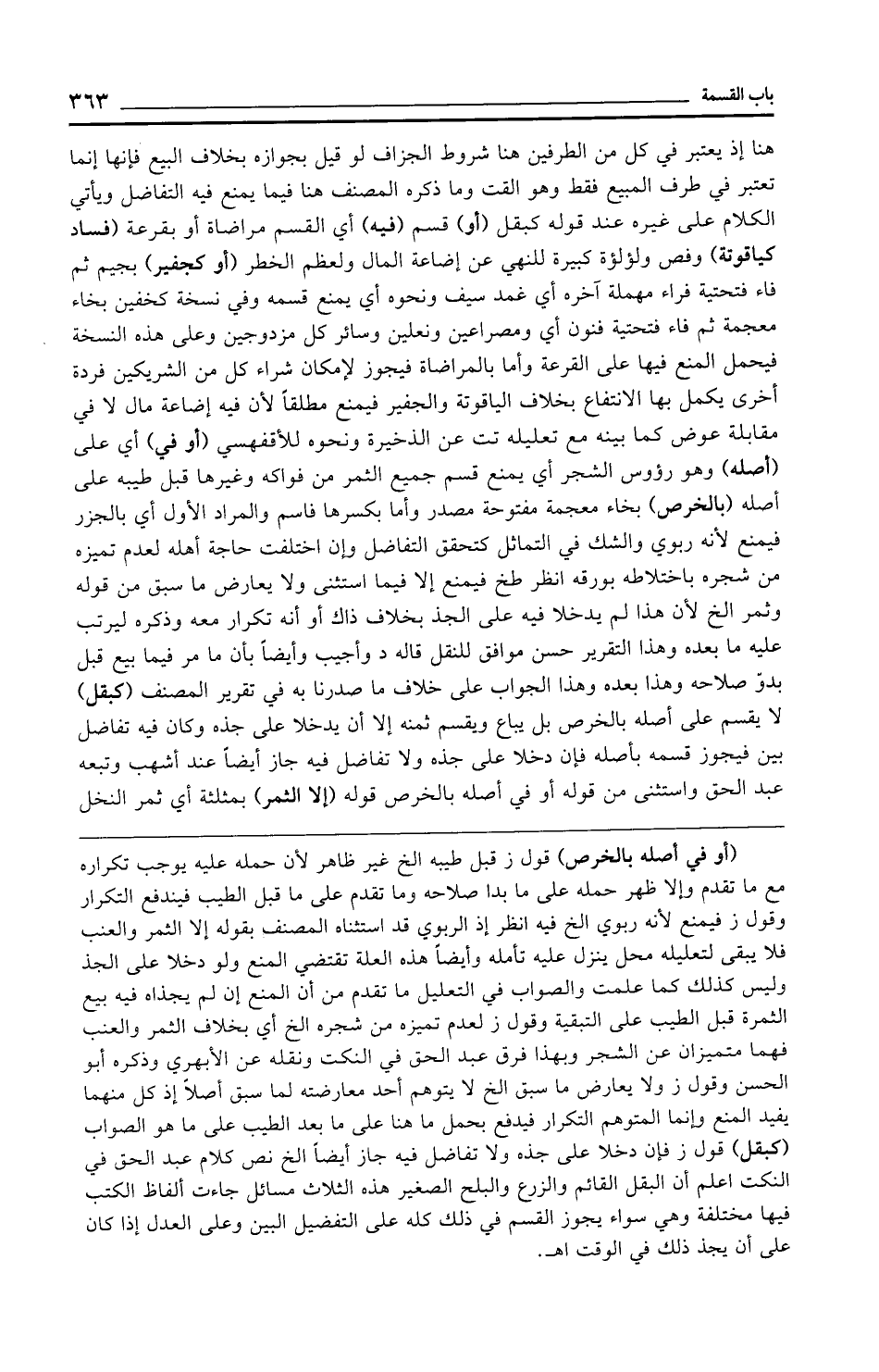 هنا إذ يعتبر في كل من الطرفين هنا شروط الجزاف لو قيل بجوازه بخلاف البيع فإنها إنما تعتبر في طرف المبيع فقط وهو القت وما ذكره المصنف هنا فيما يمنع فيه التفاضل ويأتي الكلام على غيره عند قوله كبقل (أو) قسم (فيه) أي القسم مراضاة أو بقرعة (فساد كياقوتة) وفص ولؤلؤة كبيرة للنهي عن إضاعة المال ولعظم الخطر (أو كجفير) بجيم ثم فاء فتحتية فراء مهملة آخره أي غمد سيف ونحوه أي يمنع قسمه وفي نسخة كخفين بخاء معجمة ثم فاء فتحتية فنون أي ومصراعين ونعلين وسائر كل مزدوجين وعلى هذه النسخة فيحمل المنع فيها على القرعة وأما بالمراضاة فيجوز لإمكان شراء كل من الشريكين فردة أخرى يكمل بها الانتفاع بخلاف الياقوتة والجفير فيمنع مطلقًا لأن فيه إضاعة مال لا في مقابلة عوض كما بينه مع تعليله تت عن الذخيرة ونحوه للأقفهسي (أو في) أي على (أصله) وهو رؤوس الشجر أي يمنع قسم جميع الثمر من فواكه وغيرها قبل طيبه على أصله (بالخرص) بخاء معجمة مفتوحة مصدر وأما بكسرها قاسم والمراد الأول أي بالجزر فيمنع لأنه ربوي والشك في التماثل كتحقق التفاضل وإن اختلفت حاجة أهله لعدم تميزه من شجره باختلاطه بورقه انظر طخ فيمنع إلا فيما استثنى ولا يعارض ما سبق من قوله وثمر الخ لأن هذا لم يدخلا فيه على الجذ بخلاف ذاك أو أنه تكرار معه وذكره ليرتب عليه ما بعده وهذا التقرير حسن موافق للنقل قاله د وأجيب وأيضًا بأن ما مر فيما بيع قبل بدوّ صلاحه وهذا بعده وهذا الجواب على خلاف ما صدرنا به في تقرير المصنف (كبقل) لا يقسم على أصله بالخرص بل يباع ويقسم ثمنه إلا أن يدخلا على جذه وكان فيه تفاضل بين فيجوز قسمه بأصله فإن دخلا على جده ولا تفاضل فيه جاز أيضًا عند أشهب وتبعه عبد الحق واستثنى من قوله أو في أصله بالخرص قوله (إلا الثمر) بمثلثة أي ثمر النخل